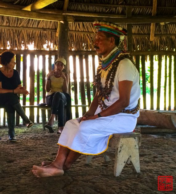 这边亚马逊流域都是信萨满教的,下午有另一个村庄的萨满巫师给我们做讲座,就是图里那位。讲述如何培养选拔考核巫师,还有他们喝的那个饮料,据说喝了才有神力能看到许多东西,可能就是传说中的Ayahuasca死藤水,听说喝了会呕吐,能净化身心什么的。很不幸的我完全无法理解这些怪力乱神,华丽丽的睡着了! 团里的西班牙妈妈还体验了他们的某种仪式,就是巫师拿着一串不知道是什么的叶子,一边嘴里念念有词的唱着,一边用叶子在身子附近扫来扫去。正式的仪式是在夜晚,所以给我们看的只是演示而已。