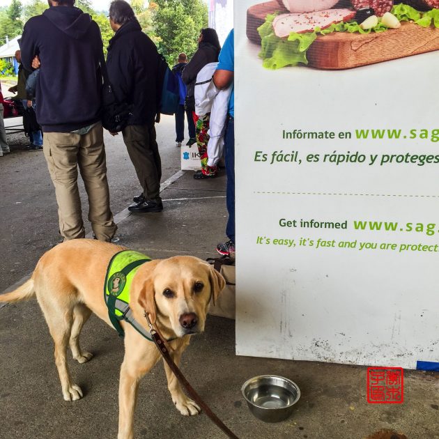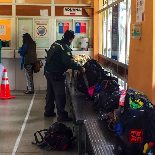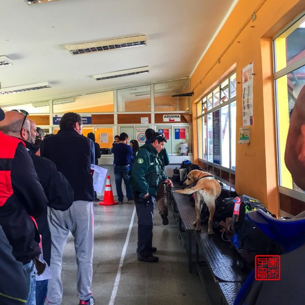 巴里洛切离智利阿根廷边境算很近了,那一边是智利的湖区,连在一起的国家公园都分阿根廷这边和智利那边有不同的名字和管理。边境检查还挺严格的,后来我发现从阿根廷入境智利非常严格,而反过来就简单到不行,所以这里也可以看出来哪个国家比较发达了吧。下车后所有的包包都要拿出来放旁边排队被检查,还有可爱的狗狗认真的工作着。以前在机场从来没看到过狗狗检查行李,也许是在行李放上传送带之前,我们没看到的地方已经被检查了。后来在几个国家发现直接就把狗放在行李的传送带上,让他们自行寻找目标。今天,不是很走运的我,被狗狗闻出了问题。其实是我带的一小包花椒和八角的调味料,大概是因为味道特别,狗狗觉得奇怪。我把它掏出来,给边检工作人员解释是para cocina(我的西班牙语也就只有这点烂词汇量。。。),工作人员倒是没难为我,从这之后我每次过境都把这一小包裹的严严实实的,再也没有被查出来。
