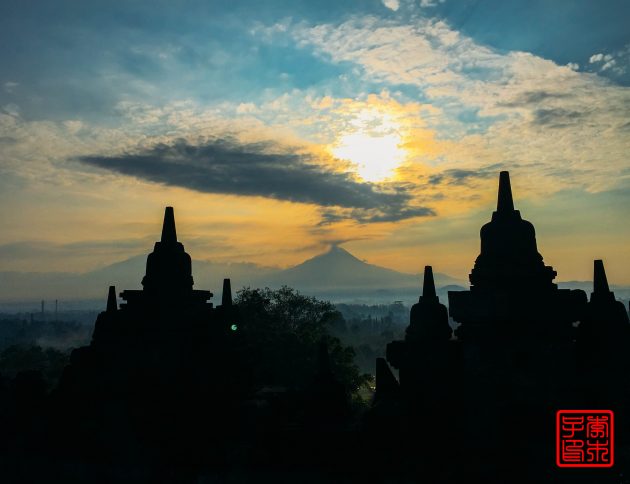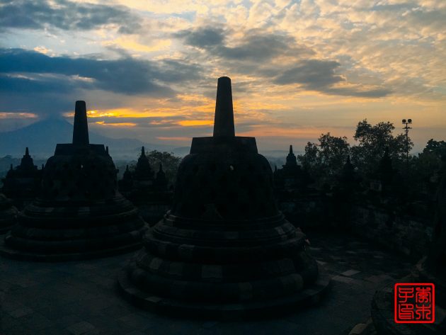 旅行团的车摸黑从日惹开到Manohara酒店,在酒店领了门票和手电筒就自行前往婆罗浮屠。爬上去发现已经有很多游客了,慢慢人越来越多,很多中国话叽叽喳喳响在耳边。理想中的是坐在佛像旁,心中虔诚的祈祷,安安静静的等待太阳的升起,远眺云雾穿梭中的丛林和高耸的火山,那种意境,想想就觉得美。但现实总是残酷的,总有人煞风景的跳出来破坏画面。。。坐在那儿等日出的时候一直想起危地马拉的Tikal,感觉画面似曾相识。不过比起Tikal下雨的日出,这次日出虽然不完美但好歹也算是成功了。