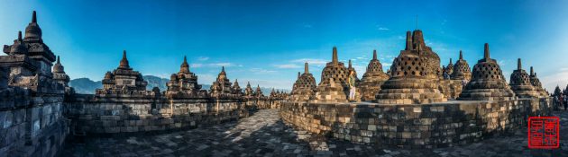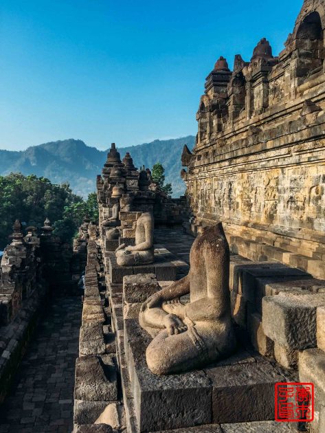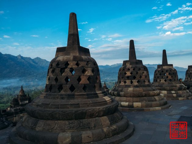 Borobudur,中文名字翻译叫婆罗浮屠,太喜欢这个翻译了,一听就有感觉。这是和长城泰姬陵吴哥窟并列东方四大奇迹的建筑,是世界最大的佛教寺庙。它大约于公元750年至850年间,由当时统治爪哇岛的夏连特拉王朝统治者兴建。因为火山爆发,使这佛塔群下沉、并隐盖于茂密的热带丛林中近千年,直到19世纪初才被清理出来。网上偷了张俯视图,真的蛮壮观的。共九层,上面三层是圆的,下面是方的,就像佛教金刚乘中的一座曼荼罗。