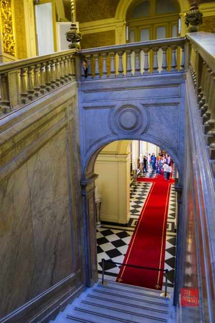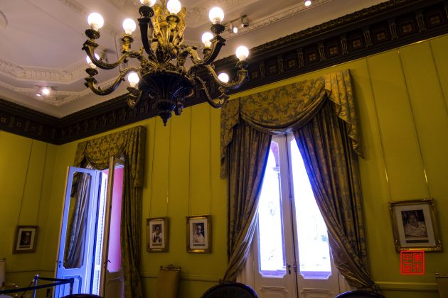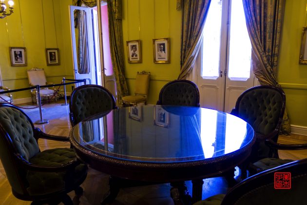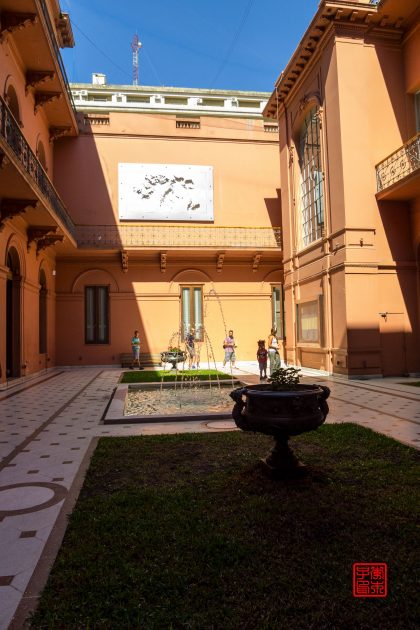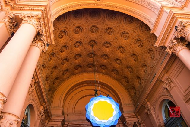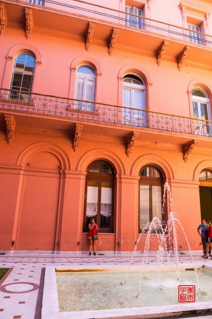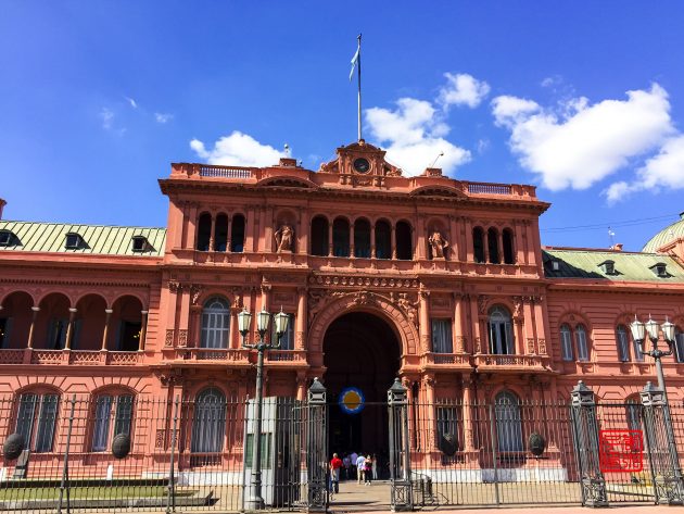 坐落在五月广场东侧的是被称为玫瑰宫(Casa Rosada)的总统府,是一座西班牙式玫瑰色建筑物。1873年,萨米恩托(Sarmiento)总统将总统府粉刷成粉红色,因为红色是当时联邦派的颜色,白色是其反对派的颜色,两种颜色放在一起就成了粉红色,也象征着各种政治派别的团结。颜色非常女性化,感觉很适合那时候的女总统。总统周一到周五在这里办公,周末是免费开放参观,可以在门口登记,按照时间有讲解员带领参观。
