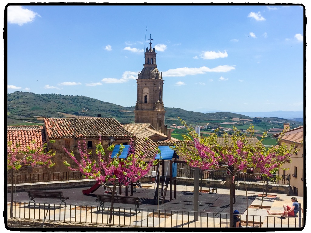 今天住宿的小镇Villamajor de Monjardín在山上,风景很赞,当然是以爬大坡做代价的。上来的时候还有人办婚礼,蛮热闹的。山顶还有个什么城堡的遗址,想想还是算了,貌似很遥远。。。我住的Hogar那一家是荷兰的什么宗教组织办的,貌似是谁给我推荐的,结果其实并不是很满意。洗澡间总是积水,有点不爽。但是有一个spinner,可以自己手动给洗的衣服甩水,这个应该每个albergue都备一个就好了,非常方便。镇上唯二的另一家旅馆听说还不错,Cepta(就是一直说的爱尔兰大妈,终于想起名字了),巴黎男生Sebastian,还有Morgan都住那边。我和Morgan一起在旁边的餐馆喝了一杯,天气好热,人都懒洋洋的,一杯Sangria消消疲劳。下图能看到那两个瑞士男孩子,他俩年纪很小大概二十岁的样子,一个总要我们叫他Red Pant因为他总穿红裤子,另一个总是穿一个厚重的皮靴,然后还带着全套的擦鞋工具,每天休息的时候就很认真的在保养鞋子,我也是醉了。