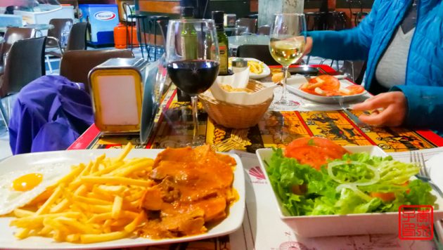 我们来到Albergue旁边的餐馆,老板超级热情,给我们的套餐也便宜好吃,太开心了。要我说,他家的薯条也比一股子怪味的汉堡王好吃的多!Roast ham也味道很不错,而且太多片了,吃撑!这一顿前餐主菜红酒的套餐才7.5欧。配菜的米饭到了西班牙就逐渐消失了。。。别看葡萄牙和西班牙相邻,感觉菜系还是有很大差别的。