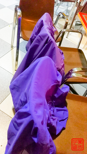 虽然她是别的牌子的,但是颜色完全撞到呀,再配上都是黑色的裤子,他的背包是荧光绿,我的背包虽然是紫色但是背包罩也是荧光绿,所以这样穿戴起来,我俩看起来还挺好笑的。。。