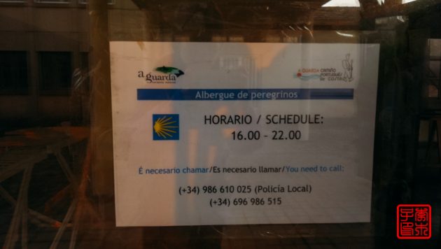 穿过A Guarda的市区,来到了今晚的住宿点Albergue de Peregrinos,也是公立的。大门紧锁,门上贴有电话,我们想也没想就打了第一个电话。。。后来来了一个老师的带着一群体育训练的小朋友们来这边修整,她说我们应该先打第二个电话给管理员,第一个电话是警察,我们仔细一看果然写着policia。。。哈哈哈,她开了门,但是建议我们说还是在外面等着好,因为屋里比外面还要冷我非常的理解,也很赞同。