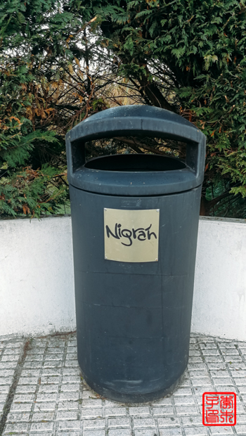 写着城市名称的垃圾桶。