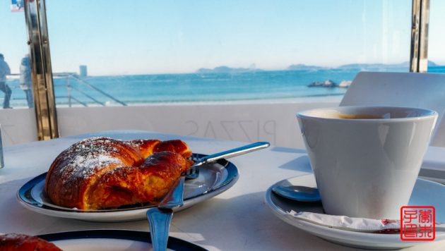 这时候离Vigo也不太远了,可能已经到了郊区了。又是周末,海边很多遛狗的,感觉我一辈子都没在一天以内见过那么多狗,不夸张的说见到的狗大概比人还多,因为有一个人溜好几条狗的。坐下来吃个早餐休息一下。她又再说这种餐厅就是吃风景的,画外之意就是太贵了,要不是为了风景是不会来吃的。可是一块面包加咖啡也只有三四欧而已。。。继续对德国人的节俭逻辑表示佩服。