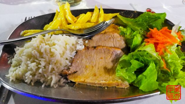 我们点了朝圣者套餐,其实也不算是套餐,没有前餐没有甜点,只有一盘沙拉米饭薯条加肉,我的是lomo,Tina点了鸡肉,味道还可以虽然看着一般但实际上超多的,没有甜点我们有点小郁闷,开始怀念西班牙了,一份9欧。吐槽葡萄牙人的餐点经常是配米饭和薯条,我几乎每次都吃不完,心想米饭和薯条只给一样就好嘛。