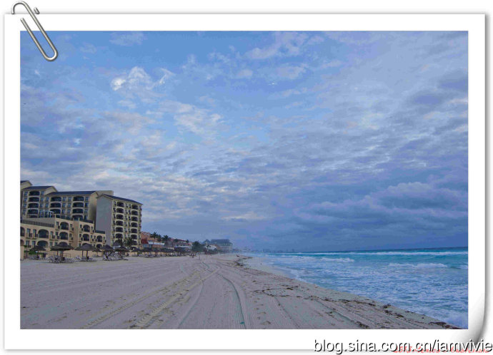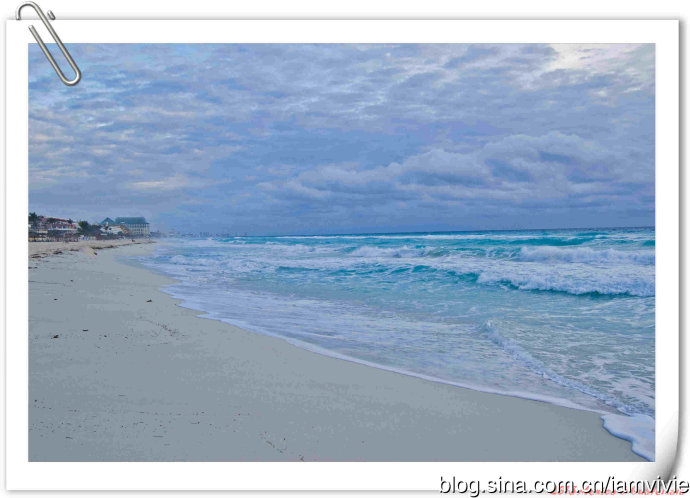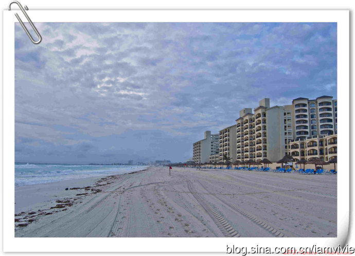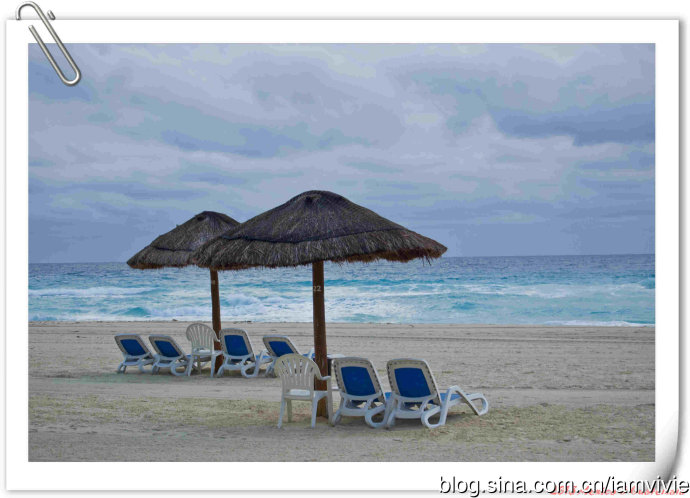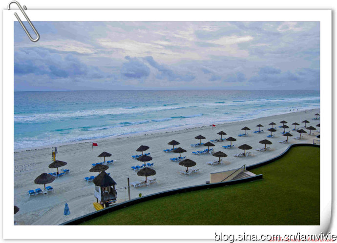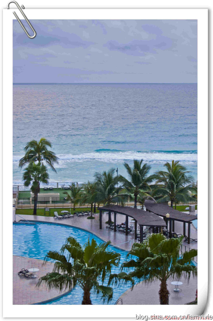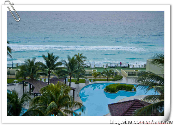 离开了晴空万里的Merida,把雨水继续带到了Cancun。我订的酒店有点远在酒店区比较靠南的位置,从汽车站打出租才150块,开了半小时呢。来到坎昆酒店,风格就完全变了,墨西哥风情都消失不见。虽然还是下雨,海水的颜色还是很漂亮。从房间窗口看出去,一副风雨欲来的架势,大浪一个接着一个的。