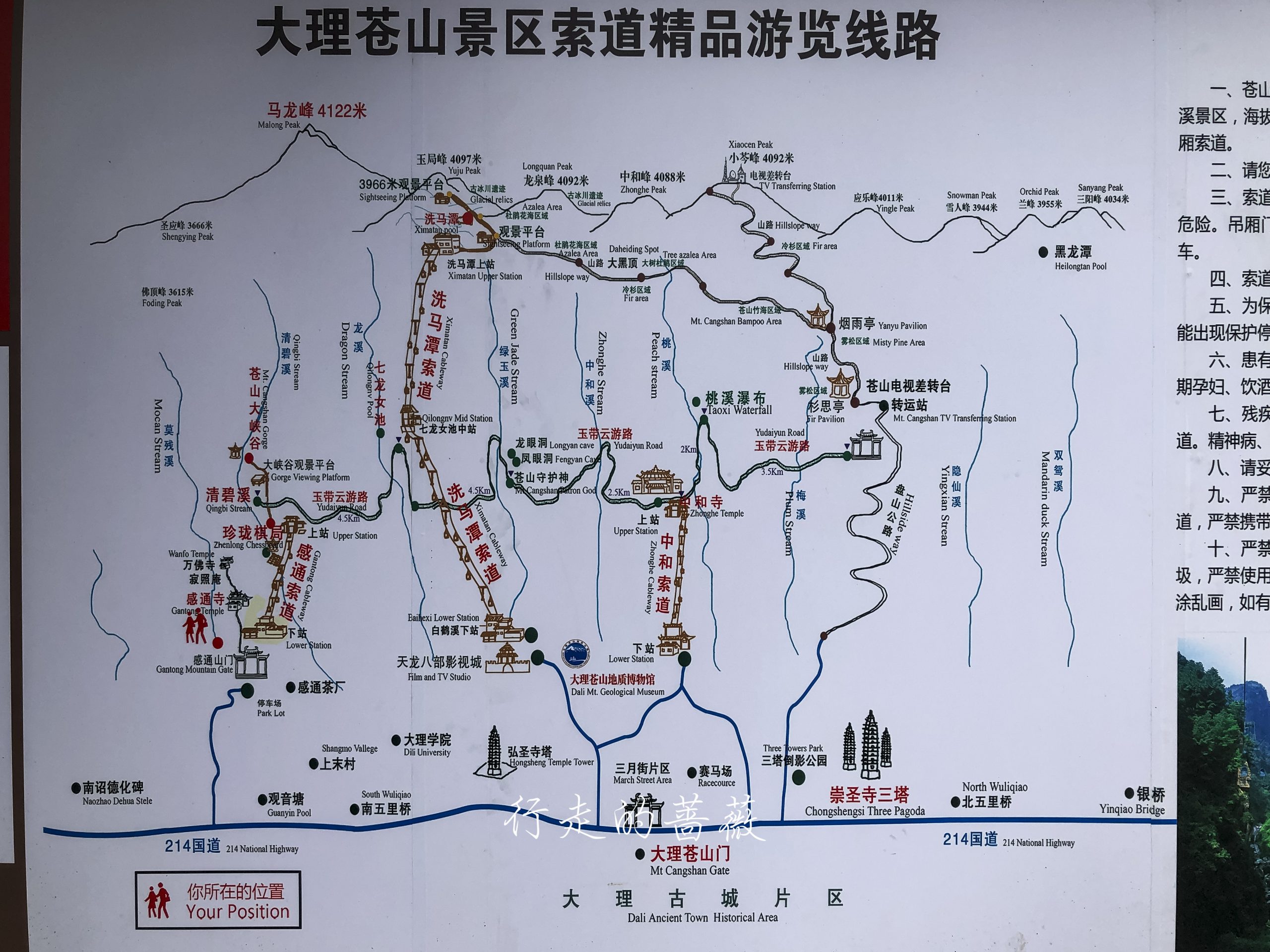 到了苍山国家地质公园门口,这里也是感通索道的乘坐处,本来在售票处想单独买个门票,工作人员说如果不坐索道的话可以上去再买门票,这里是索道和门票一起买。所以如果不到山上面,只在附近的感通寺和寄照庵转转,就是不需要门票的,这还挺不错的。整个苍山的地图还挺复杂的,不可小看。