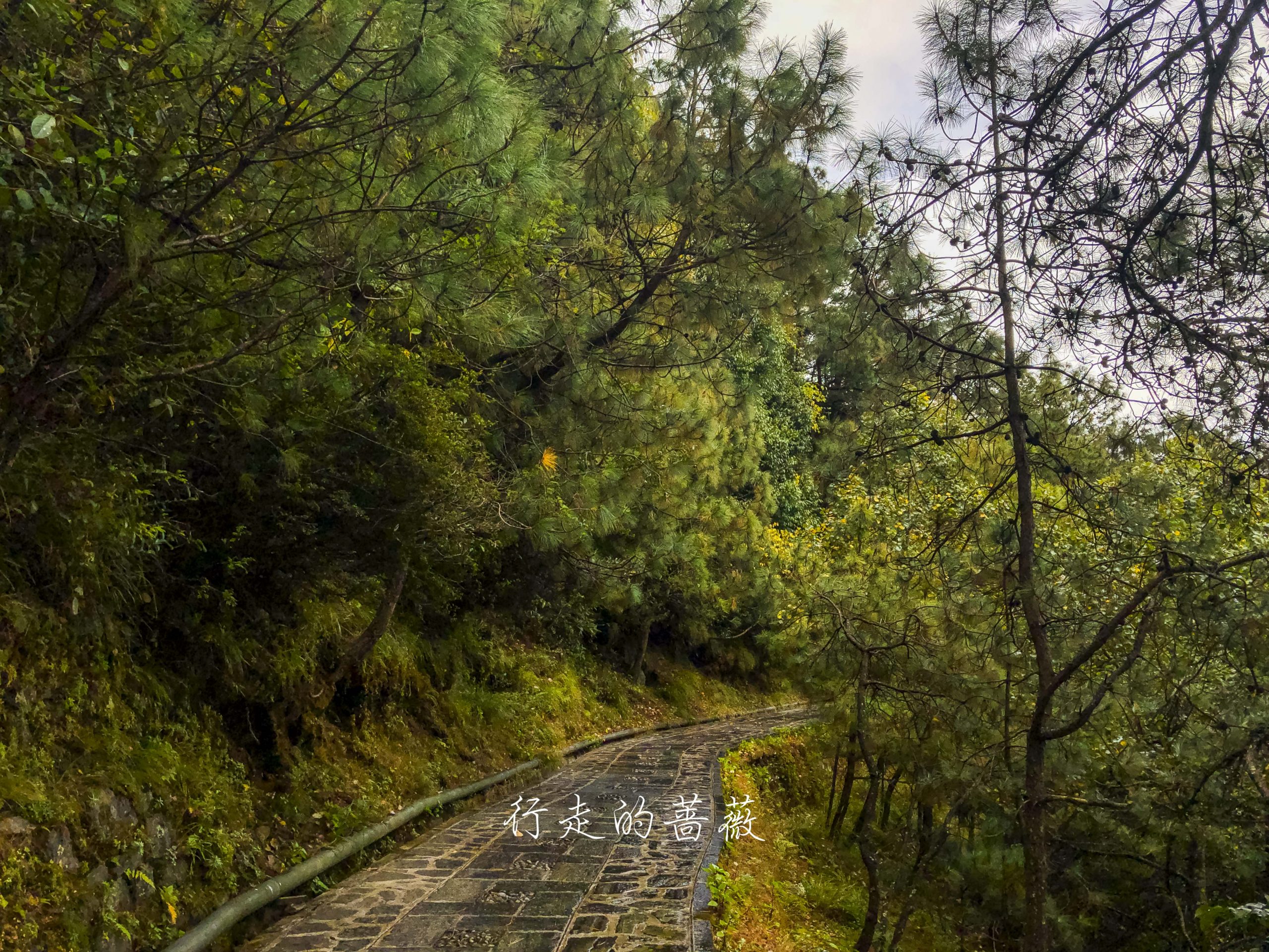 走过了那么久的下坡路,终于开始爬坡了,虽然不是很陡峭,但是需要花点力气了。下坡走的我都心慌慌,还是那句细细的名言:都是要还的!沿路有可以休息的小亭子,碰到一对小情侣,他们刚从上面感通索道下来,说是距离索道站不太远了,问我到山下还有多远,我想到那下坡路至少走了半个多小时,要是返回去爬坡还不得爬好久啊,他们纠结了一下,决定返回索道站了。。。我真心觉得是正确的选择,穿的那么美美的怎么能爬山呢。