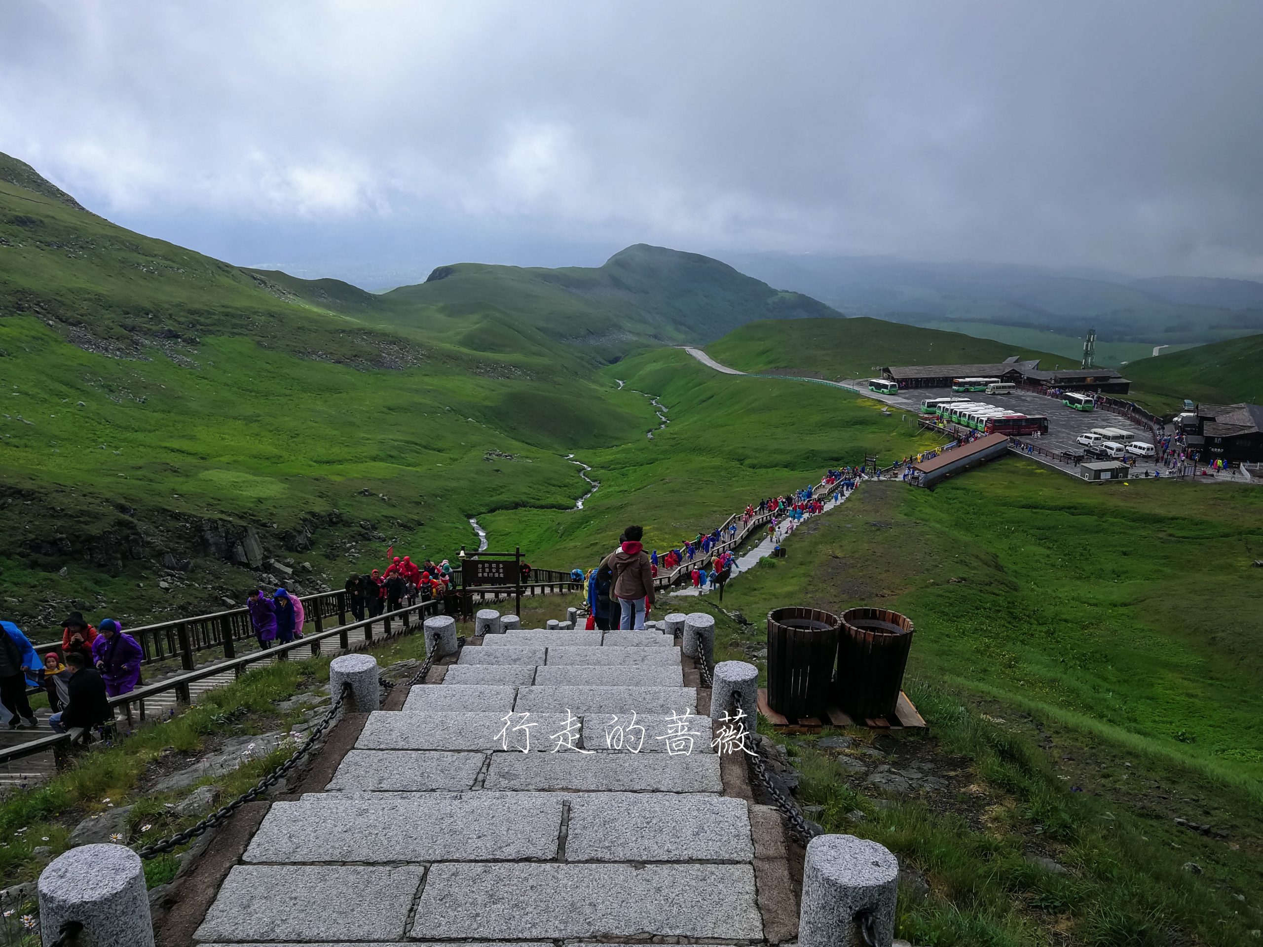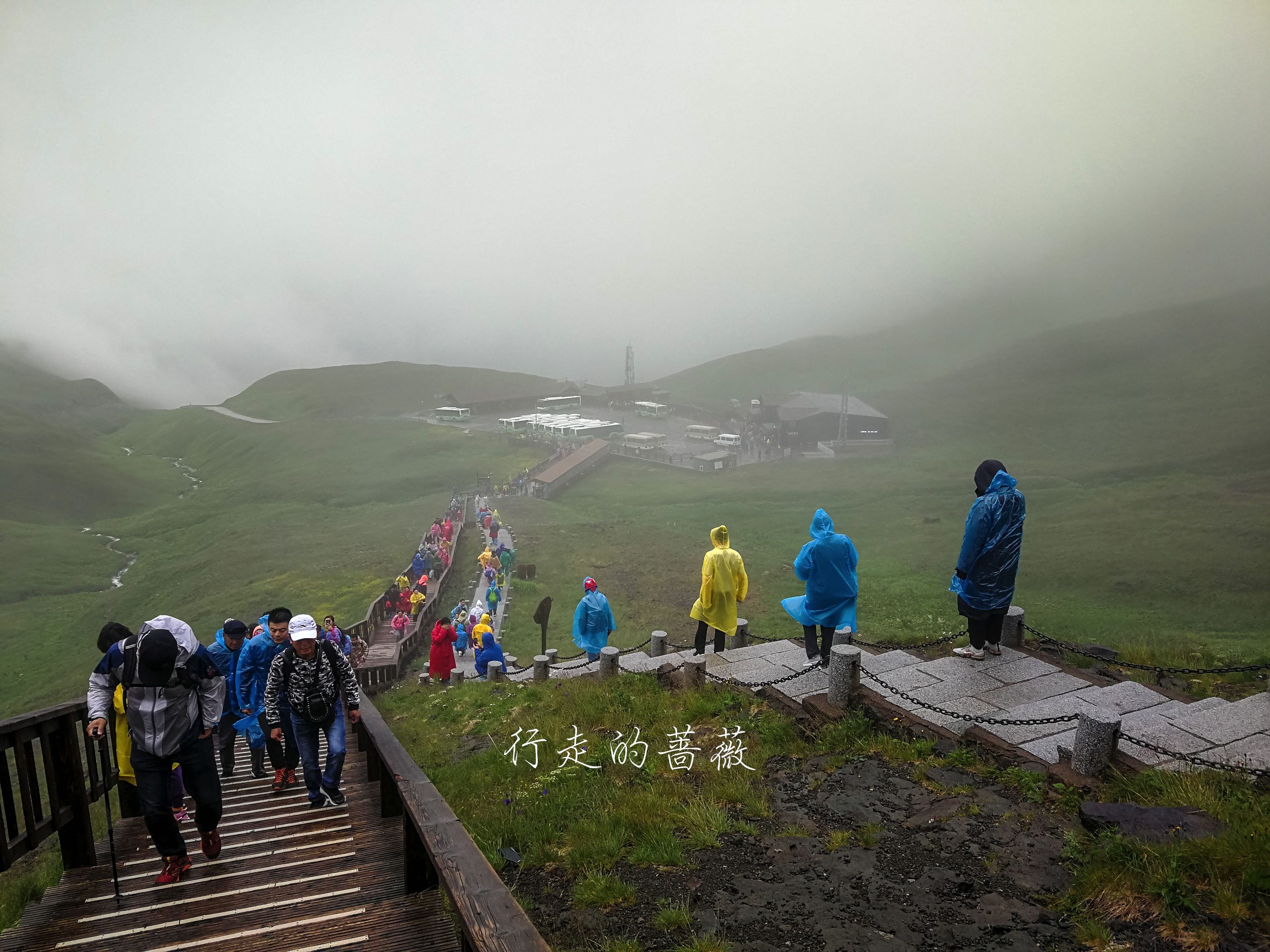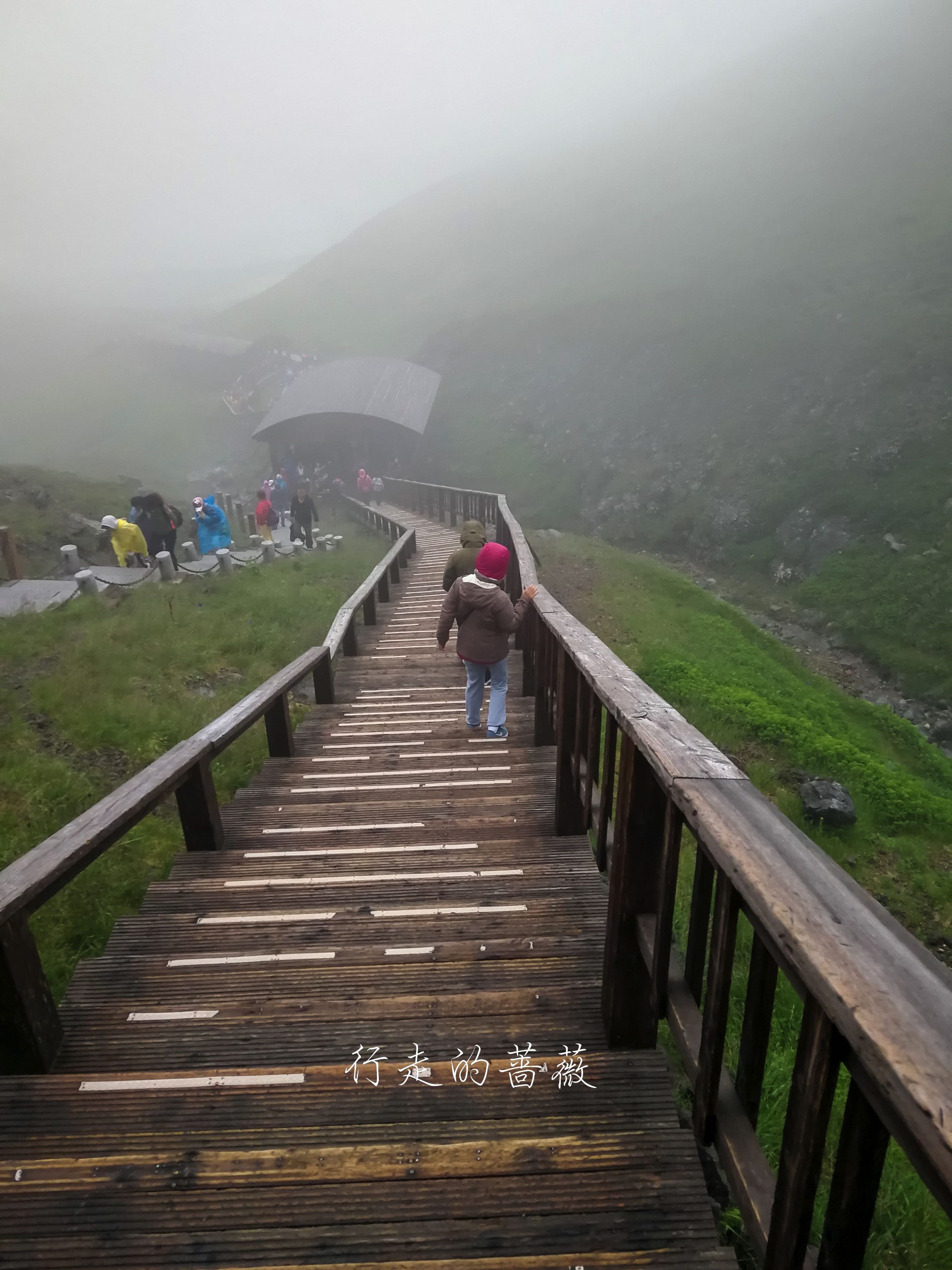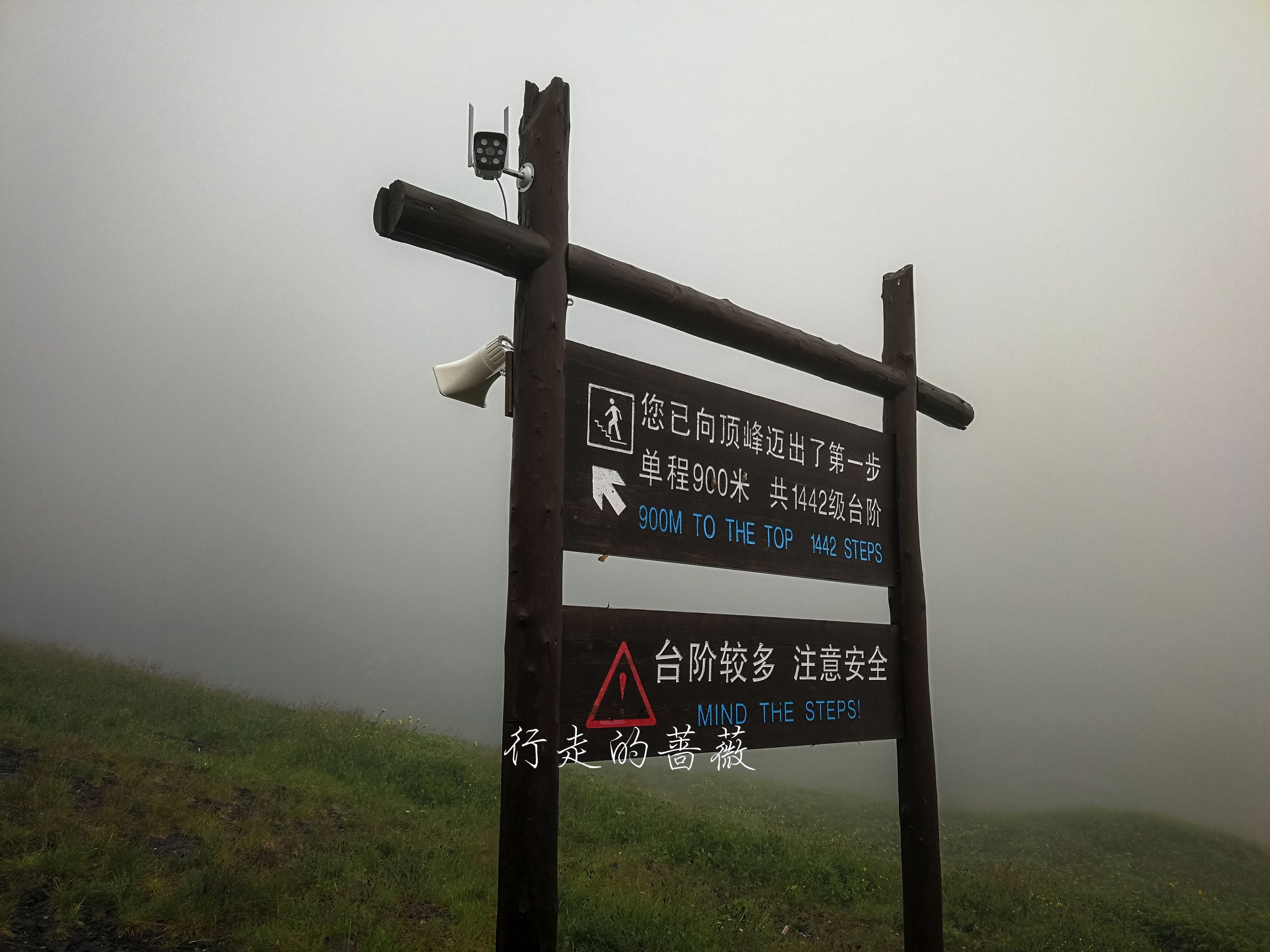坐车到了山脚下,需要爬坡单程900米,共1442台阶。越往上走雾气越重,山头完全看不到,风也很大还飘着小雨。路上修的栈道挺好走的,虽然天气不好,人还是络绎不绝。走走停停,不到一个小时也就到顶了。