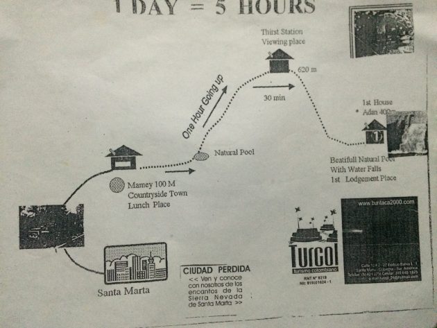 今天准备出发开始五天的Ciudad Perdida失落之城徒步,全长42km,目的地是Ciudad Perdida/Lost City/失落之城遗址,当地名字叫做Teyuna。这条路线因为2003年发生过的游客被绑架事件而变得越来越有名。当时哥伦比亚左翼和右翼组织发生军事冲突,左翼National Liberation Army (ELN) 绑架了来到这里的八名外国游客,威胁政府调查人权滥用来换取人质,最后的几个人质是事发三个多月才被释放的。2005年这条旅游路线又重新开始运营,而且由哥伦比亚军方巡逻,之后也再也没有出现过绑架事件,所以现在被认为是一条很安全的路线。