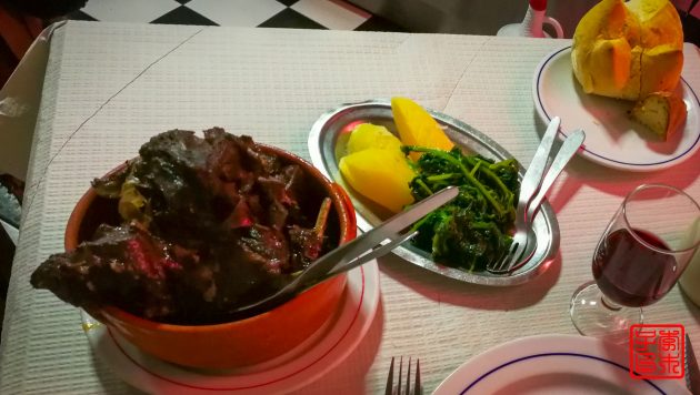 下山后去吃找了家TripAdvisor排名靠前的葡萄牙餐馆,就在小广场附近很方便,但门在小巷子里,差点找错了。屋里小小的就几张桌子,我去的早坐了门口的位置,之后就一直有人排队,还真是火爆呢。老板讲英文,给我推荐了说是当地特色的羊肉,拿上来一看,哇,这黑乎乎的有点不好看但这不就是羊蝎子吗,第一次在中国以外吃到羊脊骨,但是这个是用红酒炖的,味道还不错,因为是山羊所以羊肉的味道很浓,要能吃得了膻味的才会爱。厨房是开放式的,看得见做饭的过程,我看厨师放红酒和不要钱似得,非常豪迈哈哈。所以这盘菜再配上我要的红酒,还真是有点晕晕的。价钱很便宜,吃的非常满足。这家小餐馆叫做Ze Manel dos Ossos好评不断,推荐下,就是一定要早去不然要排队。