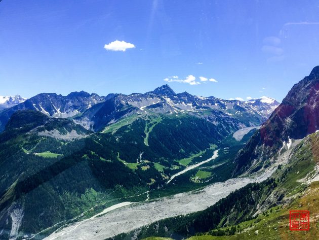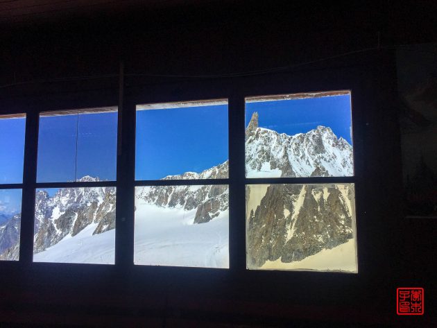 先从库意大利马约尔附近的La Palud坐索道到3462m的Point Helbronner,这一段意大利语叫做Funivia del Monte Bianco,索道人蛮少的,我们三个又包场了整个大缆车。据说这个是世界最昂贵的索道,确实蛮新蛮现代化的,全景的玻璃看窗特别爽。