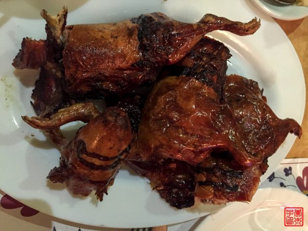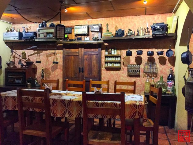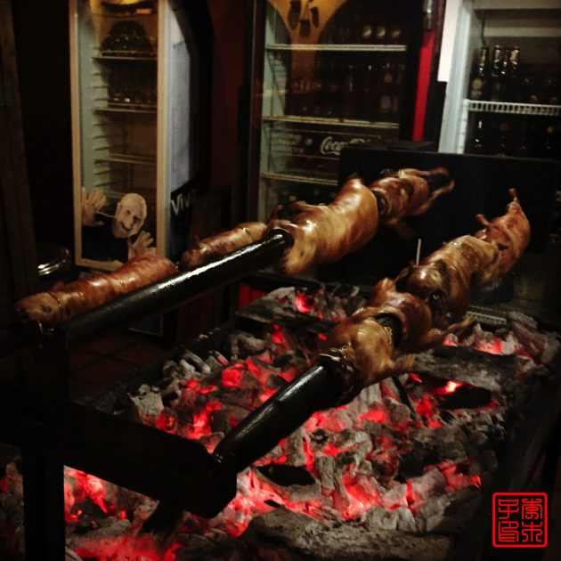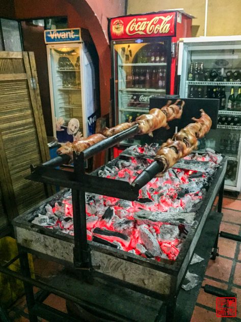 上次在秘鲁看到他们的传统食物cuy天竺鼠,看到一整只上桌还是有点可怕,就一直没尝试。厄瓜多尔也是以cuy为食物的,晚上在Audrey和Dayna的号召下下,大家决定去来一顿cuy大餐!旅馆附近有一家餐馆,我们进去后发现装饰还挺有特色的,但是因为没有预定,我们的cuy要等好一阵子才能做好。看着烤架忽然有种吃北京烤鸭的感觉。