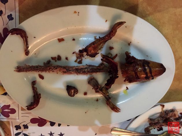 cuy上桌前就被切过了,不是一整只的形状,所以看着也没那么可怕了。我觉得其实还蛮好吃的,就是肉太少了点。Dayna好可爱,说是平时连鸡翅都不爱吃,cuy就完全不知道该从哪里下手吃。看来中国人还是和法国人比较像,很会吃,我和Audrey就都吃些别的国家不吃的被认为奇怪的食物。我们吃完还恶作剧的把骨头按照原来的形状摆好,拍照留念,哈哈哈哈哈。