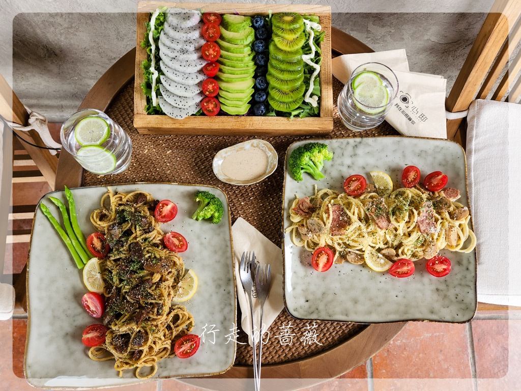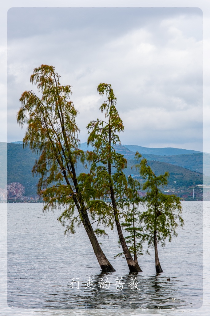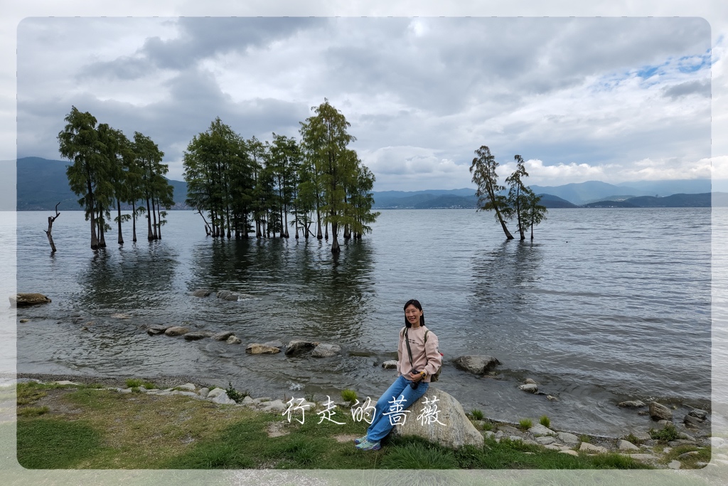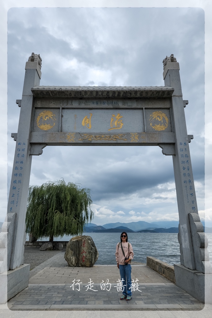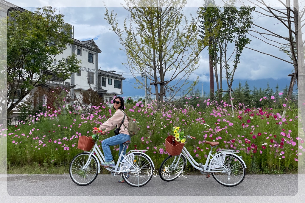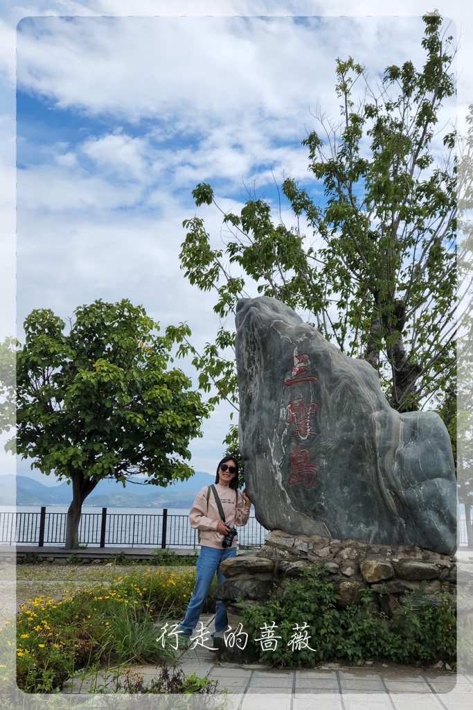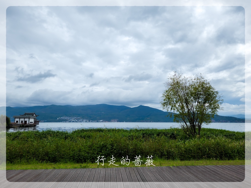 今天天阴阴的,洱海看起来就有点没有颜色,倒是很适合骑行因为不太晒。我们在才村租了两辆自行车,4小时10块钱一辆。 到了龙龛码头,就能看到比较多的游客了,听说是看日出的好地方。天气不好,照片也是很普通。 继续往前骑,来到一个巨多游客的景点,叫做三圣岛。听上去应该有个岛吧,可是只能看到湖对岸,看不到什么岛。看了看介绍,意思就是现在只有个石碑来作纪念。 这里是游客聚集区,外面是通车的,所以也有一家开业不久的咖啡店。看上去位置和环境都很不错,我们来的比较早,只有一个姑娘占据了最好的位置,我们也找了个能看到风景的房间。坐下来发现,窗外来来回回都是拍婚纱照的人,还挺有意思的。 听说之前王心凌和twins他们来云南拍的那个节目,也有来到这家店,看来我们打卡了明星同款呢。喝完咖啡,点了个简餐当午饭。这个是我见到的最多面的意大利面了,非常的慷慨,水果也是好丰盛,真的是好意外。虽然等待的时间长了点,但是看的出来是精心准备的。这家店名叫做“心邸”,还蛮有意境的。 吃饱喝足,一口气骑车回到才村。去古城南门做了核酸,买了特色烧铒块和一些卤味和啤酒,又是一顿阳台上的晚餐。