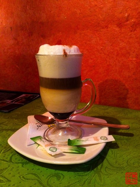 依旧是雷打不动的每天下午的雨,来到主广场旁边喝咖啡,Cappucino,1.95刀一杯,Fred说还不错,我嫌弃有点甜,而且这么一大杯耶。