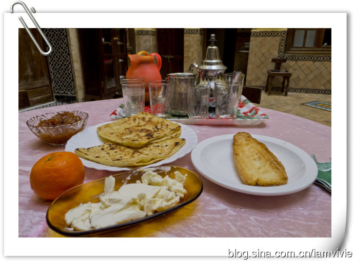早饭吃的也挺好的,摩洛哥各种各样的饼,配上椰枣酱吃起来好搞笑。没办法,摩洛哥那饼和中国的饼蛮像的,就是少了葱!所以啥味道也没有啊,给你撒点糖就端上来了。小叶吃的挺开心的,后来小叶走了,我和小悦他们一起吃,小悦作为一个北京姑娘,极大的不满意这种加糖的做法,把上面的糖和肉桂都刮下来给荷兰人吃,荷兰人吃的可开心了,哈哈哈哈。