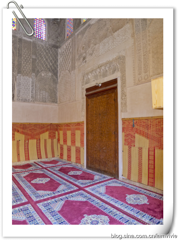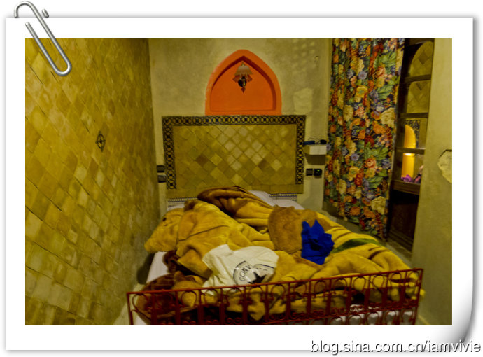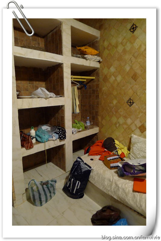 这家旅店挺不错的,就是开始分配的一进门的那一间房,窗帘不怎么给力,从二楼楼梯走下来的话就能看到屋里的卫生间。。。我们就让老板换给我们到对面那一间了。本来还停说古城里住宿洗澡不好什么的,这个卫生间热水非常强劲,算是在摩洛哥最赞的了,不过还是那个下水道问题,洗完澡一地的水唉。屋里暖气也是包的,不过是烧气的那种,睡觉的时候要关上,温度还不错啦。唯一的小缺点就是,老板不讲英语。开始除了我们,还住了一些英国人,老板竟然让我给他们翻译!额,我那蹩脚法语都自顾不及呢,还翻译额。后来英国人走了,小悦他们来了,荷兰人也是讲蹩脚法语的,哈哈哈。最后一天终于来了法国人住,老板估计也不那么郁闷了,否则我们聊天很难聊唉。第一天晚上我们把东西摊了一地,第二天晚上回来,发现竟然把我们所有的东西都整理好了,放在架子上,连毛巾都给我们熨了啊,实在太丢脸了,赶紧和打扫卫生的人说以后不要帮忙收拾房间了。对了,这一家旅馆是收欧元结账的。