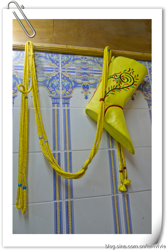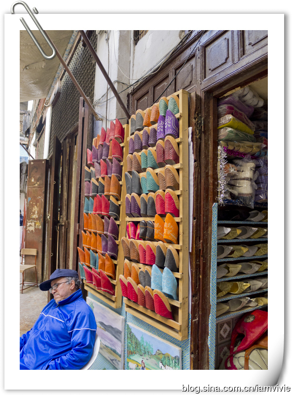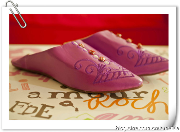 摩洛哥的皮拖鞋,大概是每人来了必买的吧,我个人很喜欢,有非常多的样式,我一眼就看上这双紫色的了,买了同样款的给细细。我们买的价钱还挺贵的,后来去街上一看都好便宜,不过导游说街上的机器做的和我们买的手工的天壤之别,哈哈哈,姑且相信他的话这样心理平衡些。
