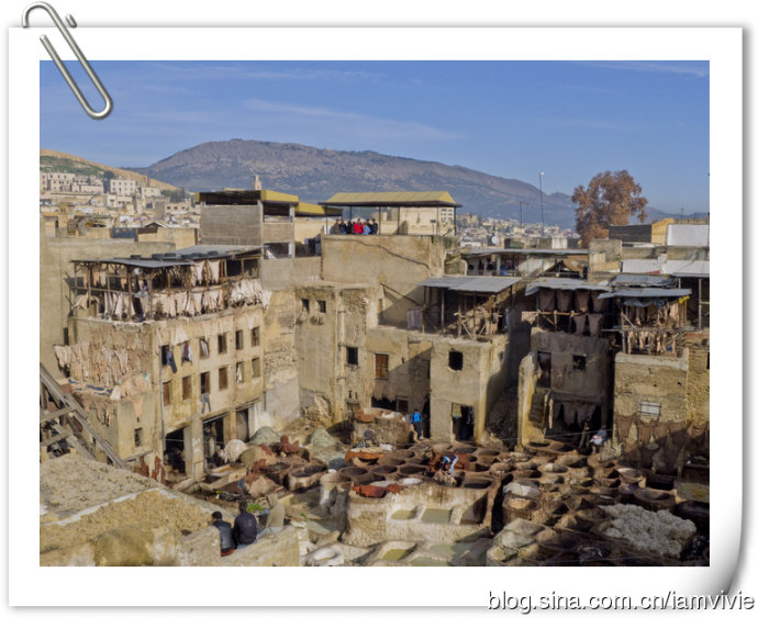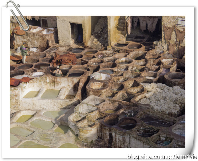 大染缸又是个必看的地方,菲斯是以皮制品著称的,所以有众多染坊。我真是非常的不理解为啥大家都兴致勃勃要参观这个,完全没有任何乐趣可说,而且又臭又脏!我做好了心理准备,拿着薄荷叶一顿猛闻,结果发现味道不是很大,据说冬天会比夏天好很多。皮子处理的主要成分是鸽子屎和牛尿,之后再加入颜色进行染色。一想到皮子是这么做出来的,还会想用吗?!哈哈哈。