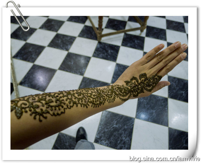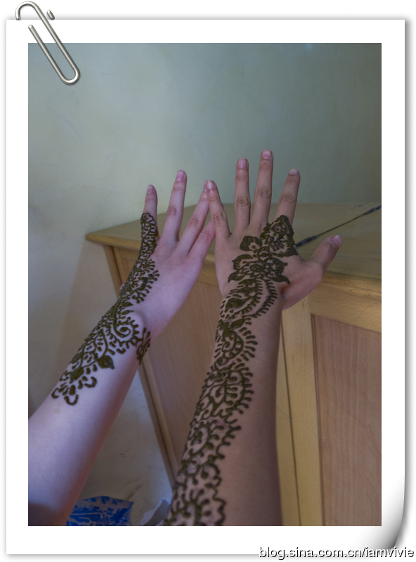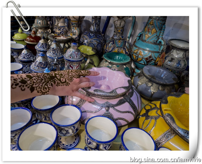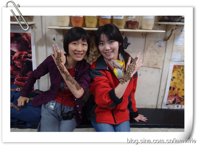 接下来是卖阿甘油还有各种草本提炼的护肤品化妆品什么的商店,买了几个罂粟花提炼的唇膏,别的好像都没啥兴趣,依旧想画henna。老板找了他老婆还是姐姐的来给我们画,看到我胳膊上在马拉喀什画的那个,她就撇撇嘴一副不屑一顾的样子,说这是什么?这哪是henna啊?!唉,花钱还要受教育,真是的。这次画个传统橙色的,就画在之前的那个黑色的上面。小叶也心痒痒,也画了一个。我好喜欢啊,就是橙色的持续时间太短,很快就变浅了。