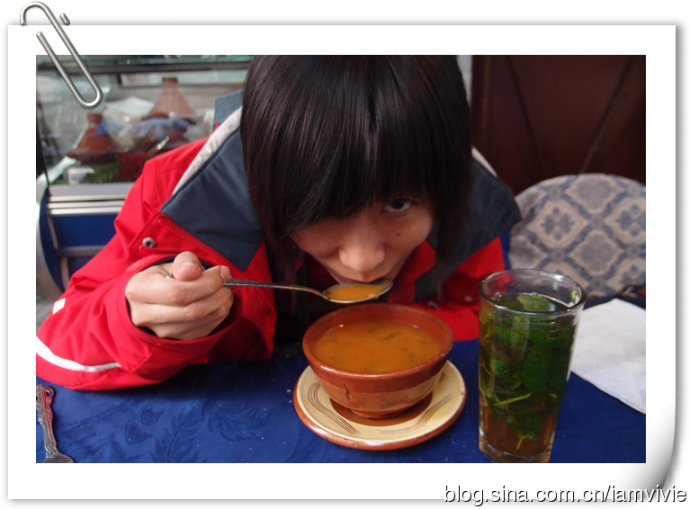 出来吃个午饭继续逛街,诡异的喝汤照片,哇哈哈,终于能看出来我的刘海儿是斜的了。那个绿绿的是著名的薄荷茶,到摩洛哥几乎顿顿都喝,只是大部分都不免费就是了唉。