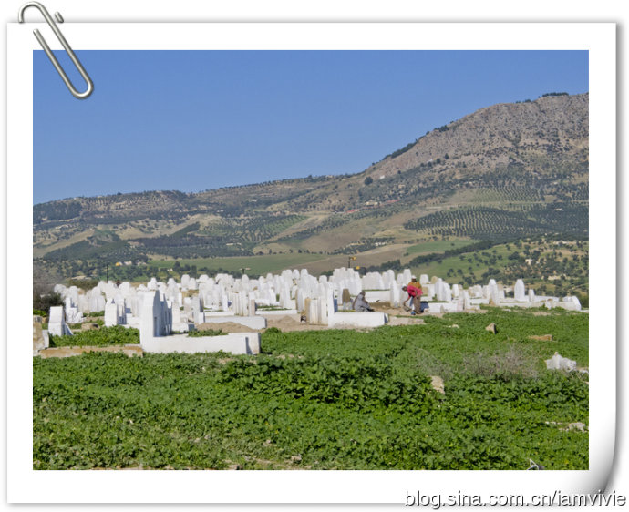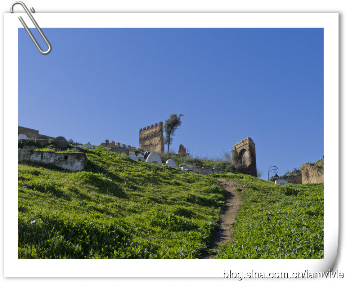 正在纠结走哪条路上山呢,结果发现另一个人拿着我同样的一本LP也在那里思考呢,我问了问你是不是也在找LP上推荐的那个路线啊,他说是的。后来七拐八拐还是找到了山顶的墓地,那里有点荒凉的说,有一片停车场,我们走过去就立刻有人上来要带路什么的,我们就和他说不用,他还一路跟着我们,我就整个一个不理。那个是个比利时人,已经第二次来菲斯了,比较有经验还讲法语,把那带路的摆脱了。其实有什么可带路的呢,沿着上路走上去就是了。山顶可以俯瞰菲斯古城,虽然破旧的很,但是还是小壮观的。
