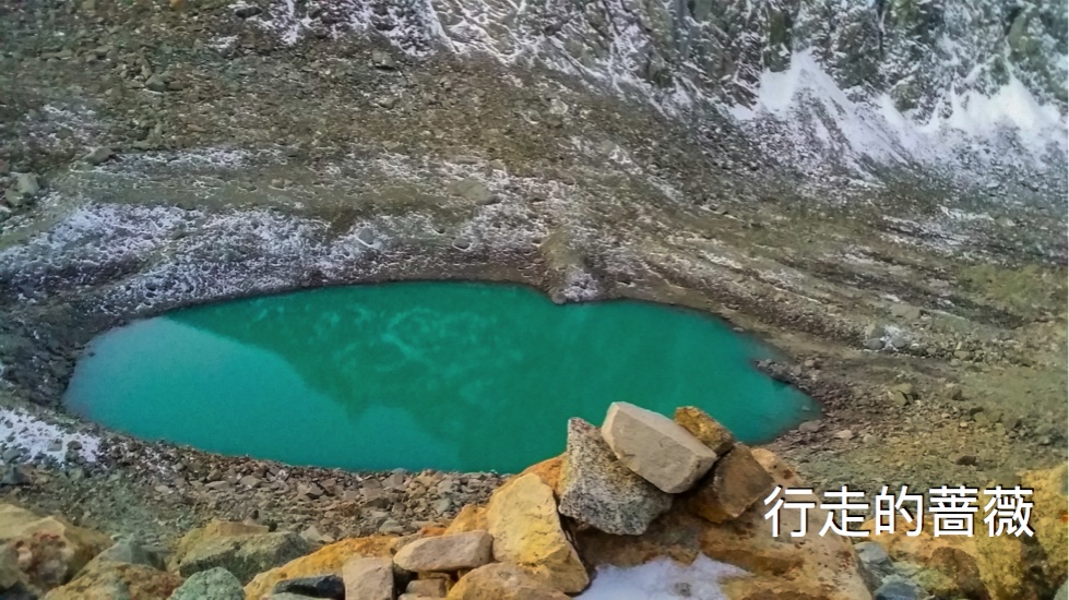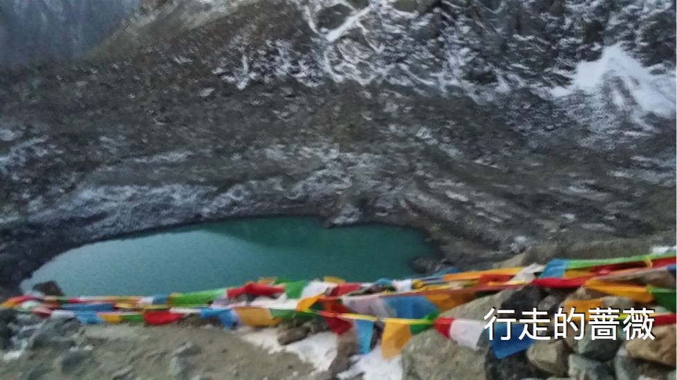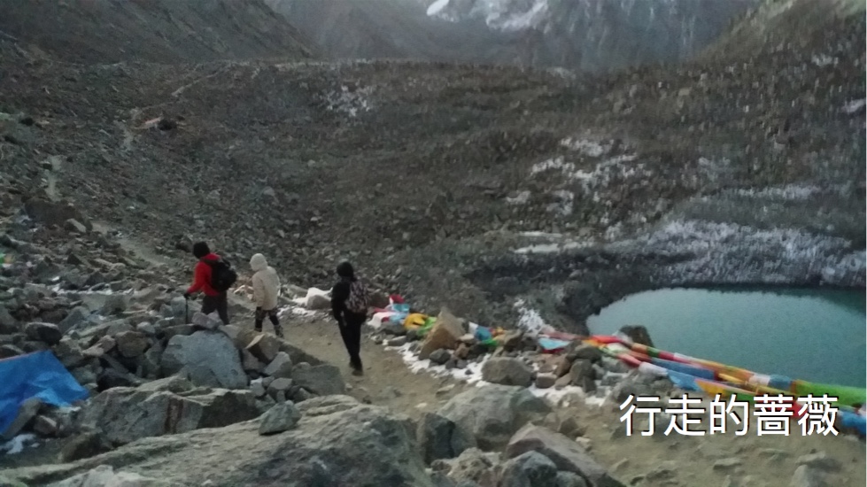 今天的第一个小目标是翻越5630m的卓玛拉山口。早上还是蛮冷的,万里带着大家一起走,开始一阵混乱,胡mm有点低血糖赶紧塞颗巧克力补补。神灯同学不断的申请系鞋带,好趁机坐地上休息。嫦mm走走就说不行了。万里安排后野和李哥走在队伍后面确保不会有人落下,走一段就站着休息一小会儿。觉得辛苦的女生把背包给男生背。我感觉还行,因为坡度还是比较缓,顾及大家的状况所以行进速度也比较慢,不是太累,就是一停下就好冷。呼哧呼哧的大喘气儿当然免不了,但我感觉比上次在秘鲁冲击5800m的misti好很多,大概还是地形容易些。一路要经过号称死亡谷和地狱坡两段儿,反正暗喽喽的也不知前路如何,就闷着头往前走就是了。路边皑皑的白雪,一坡接着一坡,总也有到头的时候。一路总有藏民超越我们,还和我们说扎西德勒,看他们闲庭信步一脸的轻松,跟在城里走街串巷没什么差别。终于到了卓玛拉山口,这次徒步的最高点,要是没人提醒的话肯定就能错过了,因为并不是一个视野开阔的顶点,看起来超级普通,我连到此一游照好像都没拍。只有这个牛奶绿的高山湖还比较有特色。