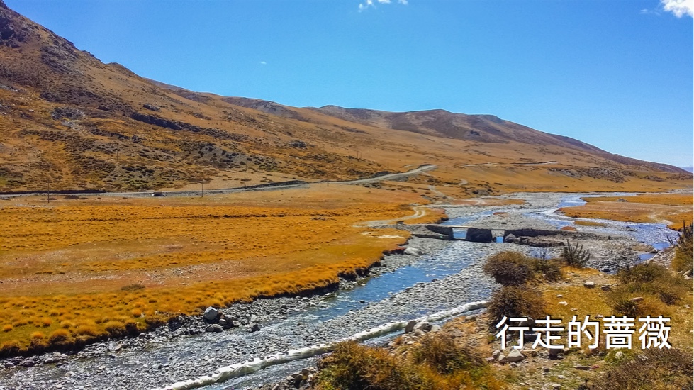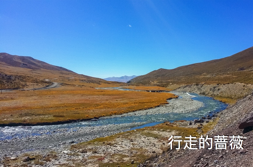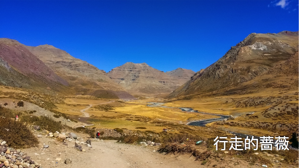 下午终于到了尊珠寺,如果是三天转山的话,这里是第二天的宿营地。还剩最后12km了!喝了可乐继续行进。没想到最难熬的是最后这一段,虽然没有什么难度的挑战,但是是对体力和心理的挑战,完全是筋疲力尽。。。想我走西班牙朝圣者之路的时候走得最多的一天也就才38km,还是没海拔的平路。今天是高海拔爬升加下降32km,确实是辛苦。我之前把一根登山杖借给了嫦mm,自己只用一根,所以走到后面感觉一个腿的膝盖稍微爬坡就会有点痛。山谷风景不错,草地都变黄了,金灿灿的一片片,小河穿流而过,我还蛮喜欢这一段的。
