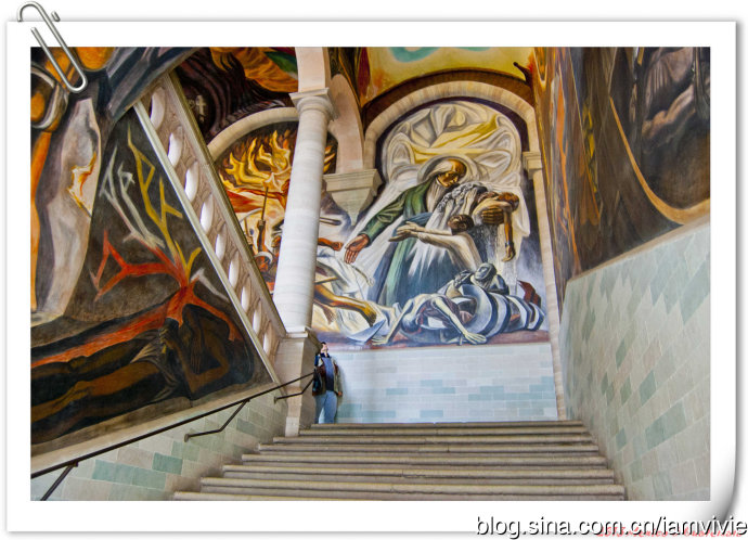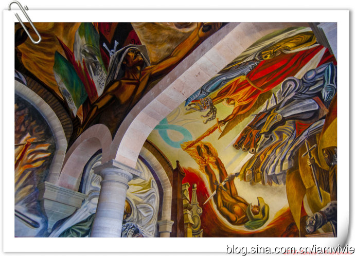 接着走到的好像叫做瓜纳华托某某某博物馆(MUSEO REGIONAL DE GUANAJUATO ALHONDIGA DE GRANADITAS)。由以前的粮仓改建的,门票49。我除了楼梯上的壁画印象很深刻,里面的其他内容都没怎么看懂。楼下有几个人的头像,回来查了查原来是墨西哥独立战争的几个主要参与者Miguel Hidalgo, Ignacio Allende, Juan Aldama, 和 José Mariano Jiménez,他们带领的叛乱分子威胁要掌管这座城市,当时的西班牙军官和其他西班牙后裔就藏身于此,认为这座建筑能抵挡的住攻击。结果反叛军包围了谷仓,开始投掷石块,民族英雄出现了,本地一位很强壮的矿工皮皮拉,英勇的背着一块大石头抵挡住子弹射击,在门口撒上汽油用火把点燃。当门坍塌后,叛乱分子大量涌入,大部分藏身于此的西班牙家庭遭到屠杀,最后焚烧了数百具尸体,整个城市遭到洗劫。因为害怕重复瓜纳华托的屠杀和洗劫,Hildago对墨西哥城的攻击却步了。