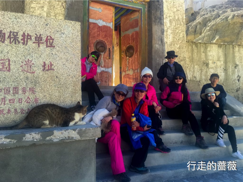 这里山腰上坐落有几座寺庙,有管理人员开门给我们参观,里面有各种雕塑佛像和精美壁画。这些寺庙都带有浓郁的西藏建筑风格,寺庙飞檐上雕饰的图案多为狮、象、马、孔雀等动物,这种雕饰大概与从冈底斯山脉分流的四条神水:同时也是印度河上游的主要河流——狮泉河、象泉河、马泉河、孔雀河的传说有关。