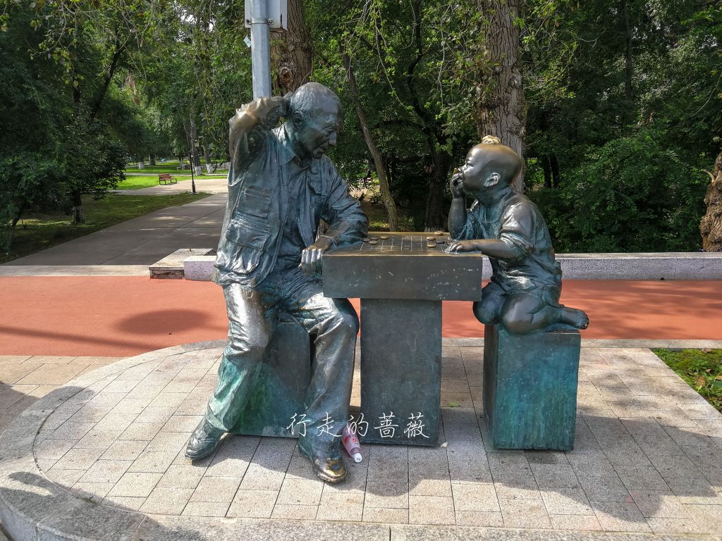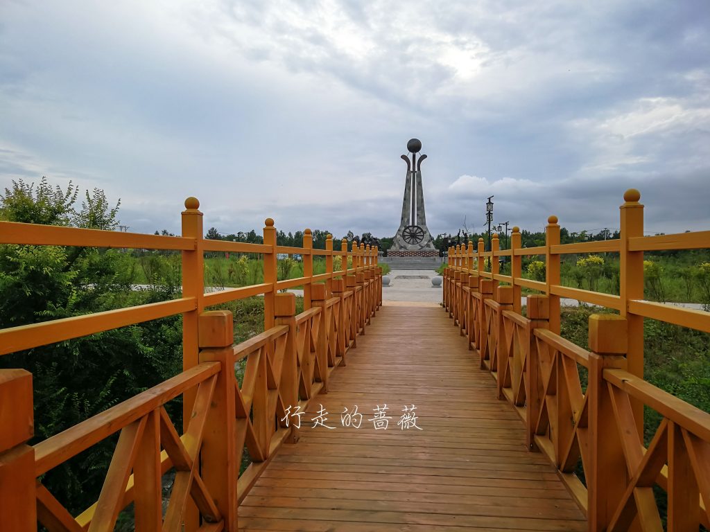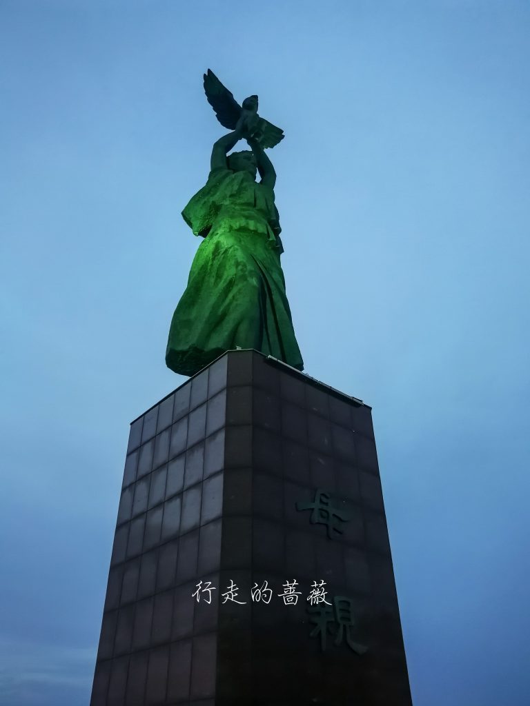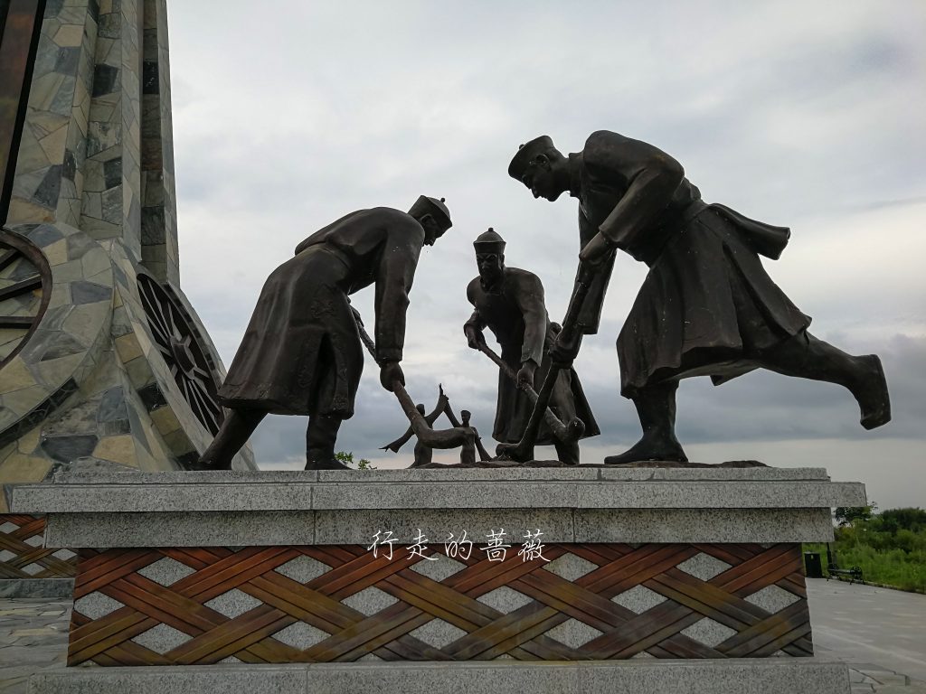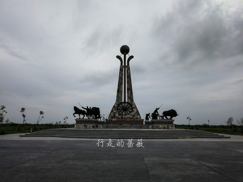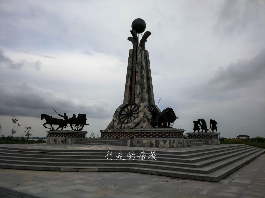 进入黑河市区以前,路过几个小景点。这个是富拉尔基达斡尔族南迁广场,是为了纪念1654年达斡尔族人奉清顺治帝旨意大规模从外加尔湖地区向黑龙江南岸迁徙。四角的四个雕塑分别是垦荒牛、曲棍球、马车、舞蹈,记录了达斡尔族人南迁的历史和文化。