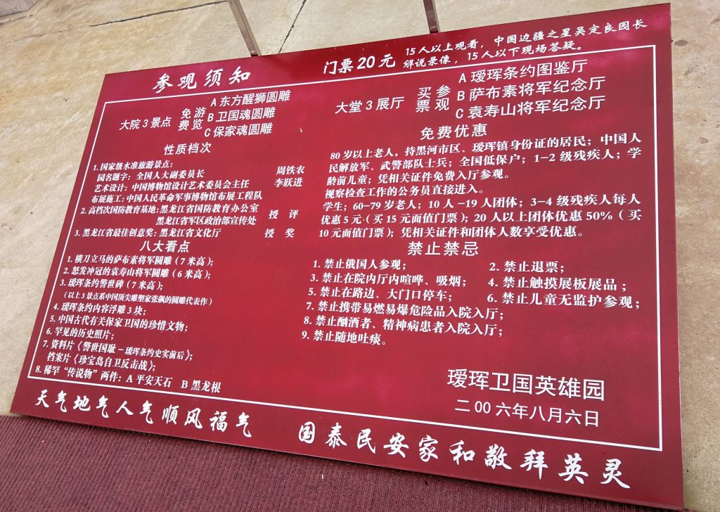 这个瑷珲卫国英雄园竟然要门票,80岁以上才免票,难怪门口连车都没有。没有进去参观,外面看总觉得像坑爹景点。