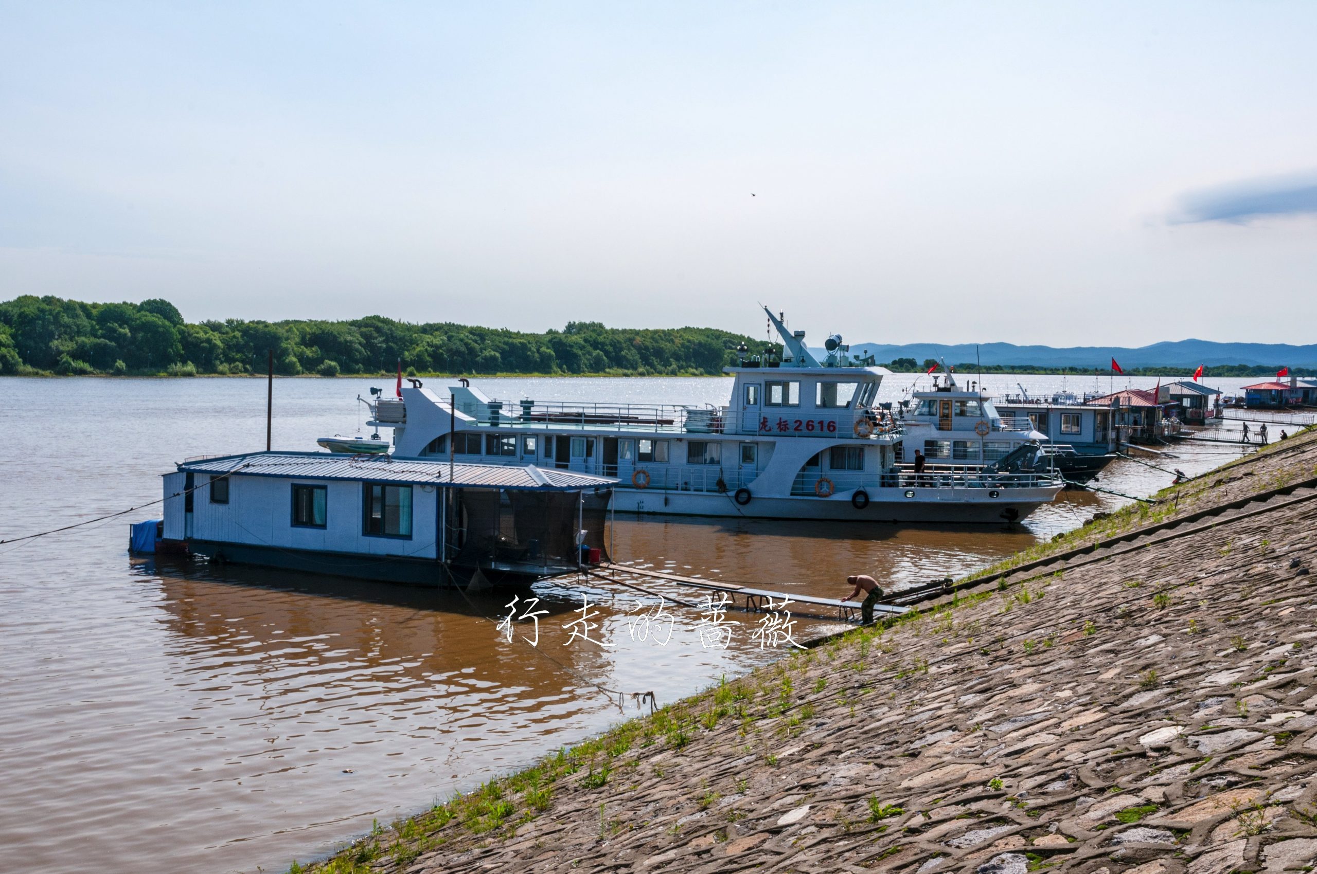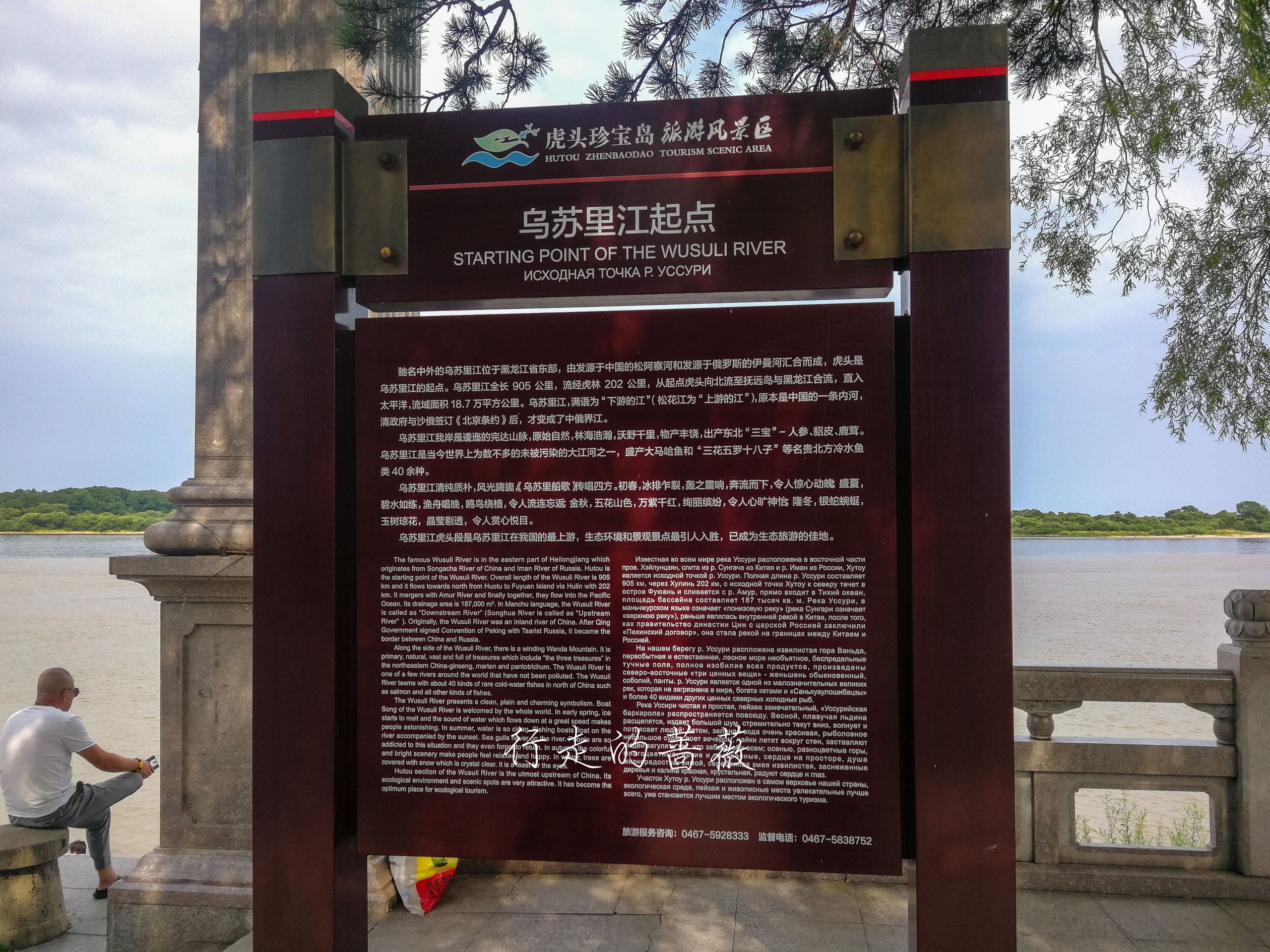 距离要塞不远的江边,号称这里是乌苏里江起点,是乌苏里江的最上游。乌苏里江本来是中国的一条内河,自从清朝政府与沙俄签订了不平等的《北京条约》以后,江东岸的广大地域被沙俄强占了去,它才成了一条界江,在俄罗斯称为阿穆尔河。最神奇的是,从这里看过去江水像是从中间分开了,中国这边很浑浊的黄色,俄罗斯那边倒是清澈的绿色,难道是中国的污染太严重了吗。。。不过大概可能只是光线的问题。