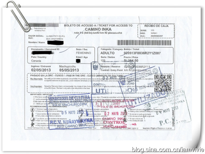 从太阳门下来,我们要先出去,然后在重新从入口进来。门口得到了一个马丘比丘的章盖到护照上秘鲁那一页,Franco还给了我们印加古道的门票,盖满了各个检查站的章子。我们称这为我们的死亡证明,证明我们死过一回了,哈哈!