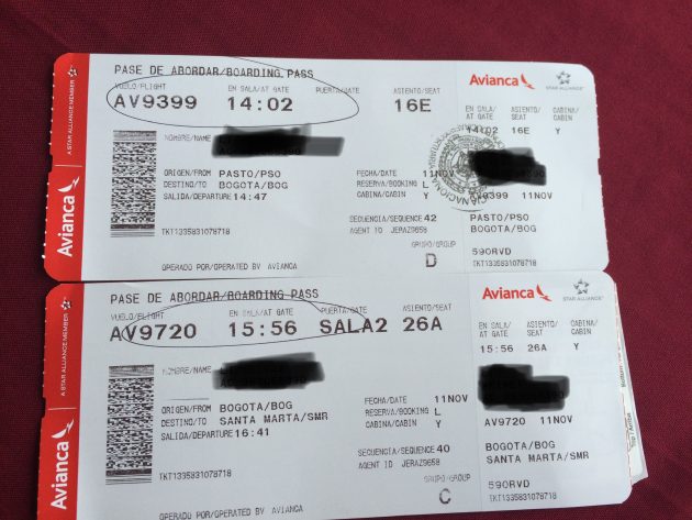 Avianca飞到圣玛尔塔的机票是波哥大转机的,看这登机牌本来时间挺好的。第一班Pasto飞波哥大的飞机,因为波哥大天气不好,从波哥大飞来已经晚点了,所以原来的两架预定的飞机只能飞一架,就让有联程机票的分先飞,幸好我是联程可以飞。群众可是立刻就暴动了,乌乌泱泱的人都涌到柜台了有点可怕。我也听不懂,也不知道发生了什么,心想最差就睡机场了吧,睡袋还好在身边。安检的时候竟然把手机也忘在篮子里,还好工作人员有喊我回去拿,万幸。搞到四点多才顺利飞走。