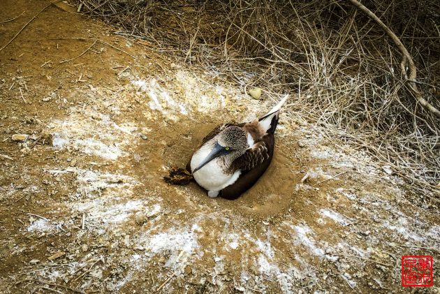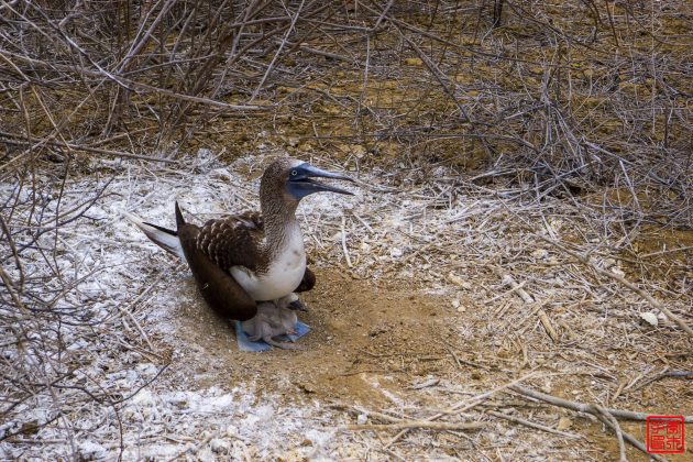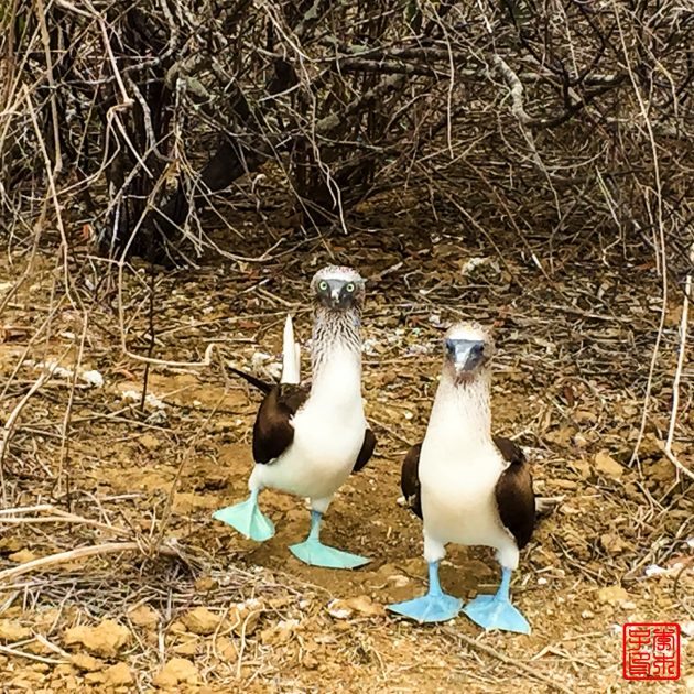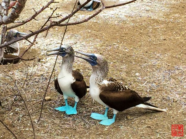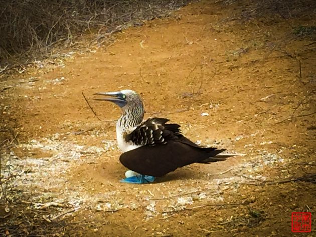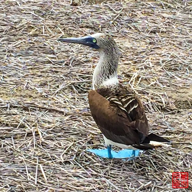 看见很多蓝脚鲣鸟blue-footed booby,非常镇定完全不理我们,自己该干嘛干嘛。今天一路有很多,连去过加拉帕戈斯群岛的长老都说,在那边都没看到那么多形态各异的!它们的脚的颜色不是一出生就是蓝色的,好像是和饮食有关,慢慢变的。它们正面的脸看着你的时候,简直傻爆了!