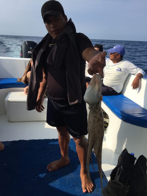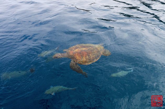 岛上参观完就把船开出来大家浮潜,光是在船边撒点食物,大海龟就一个接着一个来了。有人收获大章鱼一只!