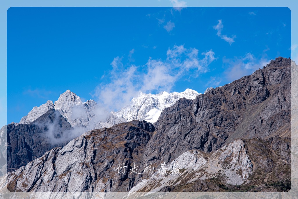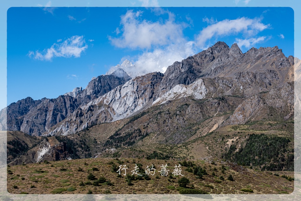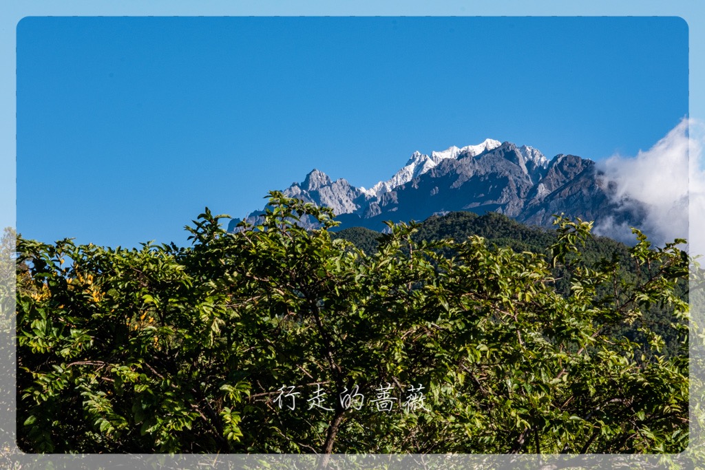 吃饱喝足,继续爬山。因为已经到山顶了,没有森林的遮挡,风非常非常的大。站在石头上拍照都很怕被吹走,悲剧就是回来看相机拍的照片大多是糊的。。。这里能近距离看到玉龙雪山的几个山峰,岩石质地都很不一样。最好辨别的是常年积雪的最高峰扇子陡海拔5596m,但越来越藏进云里面了。听说前几天山顶才刚刚下了秋天的第一场大雪,积雪大概有所增加。