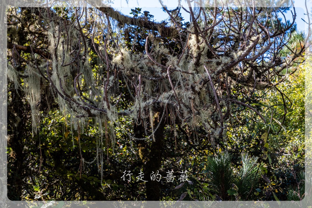 开始在森林里徒步,这边空气质量是相当好的,到处都能看到挂在树上的松萝。这个海拔大多是云杉林,徒步的路也是原始的土路,完全没有人工痕迹,刚开始爬还挺喘的,慢慢走。