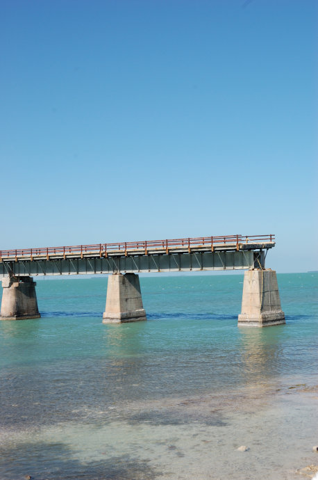 这个Pigeon Key是当年修桥的工人门住的地方,在20世界初,有个富豪决定投资修桥修铁路连接Key West和美国本土,因为Key West和古巴太近了,生意好做得很。后来一场超级飓风导致桥损坏了,也就没再用了。在那之后联邦又投资修了新桥,也就是号称7 Mile的那一座,在真实的谎言那部电影里出镜了之后就名声大气。岛上有当年的一些房子还有博物馆什么的,上旧桥看看,还有人在桥上骑自行车,想着那大风还不要骑的东倒西歪的,我们去拍了几张照片就撤了,冷呀!这岛照相不错,否则我都不知道去哪里能照到海景和桥景,路上连个停车的地方都没有,碧海蓝天真的很美。