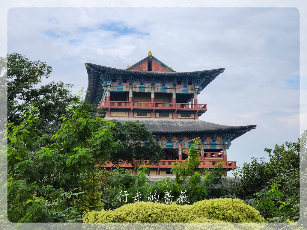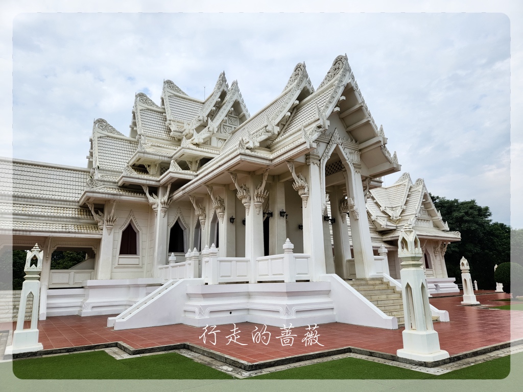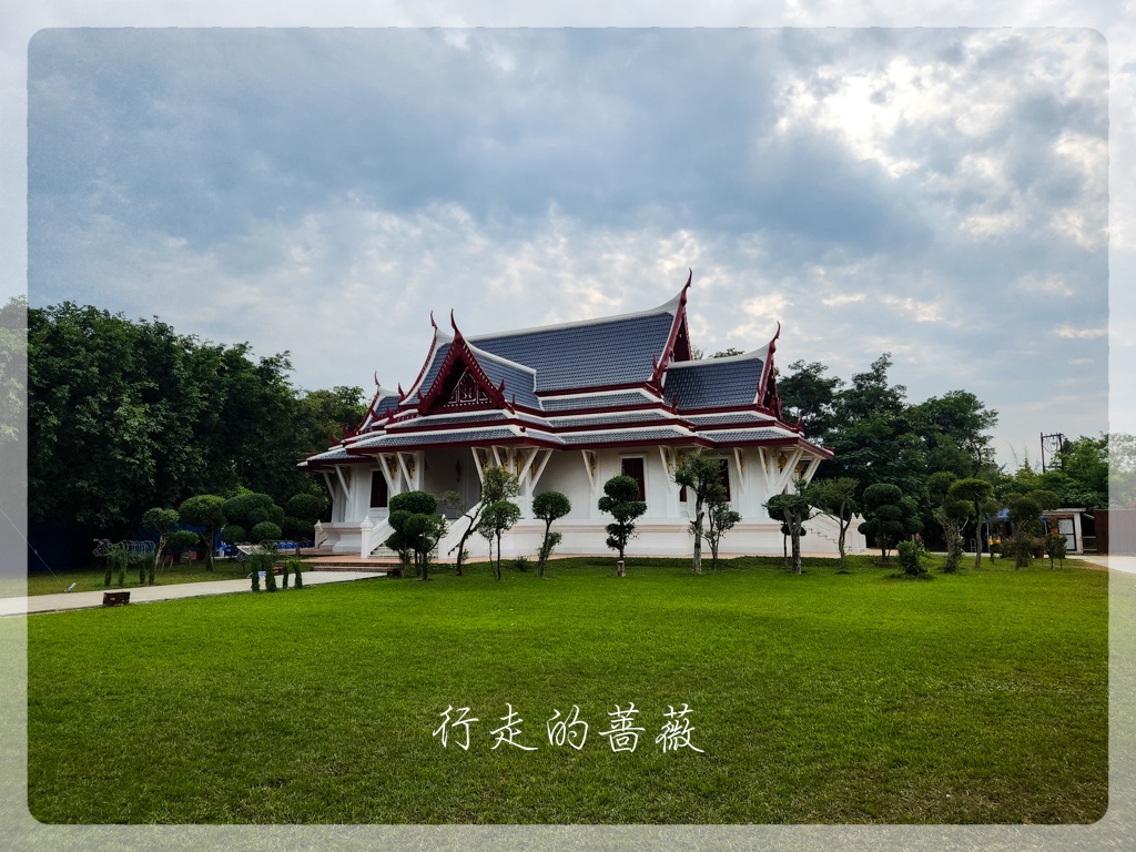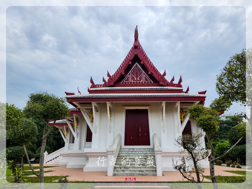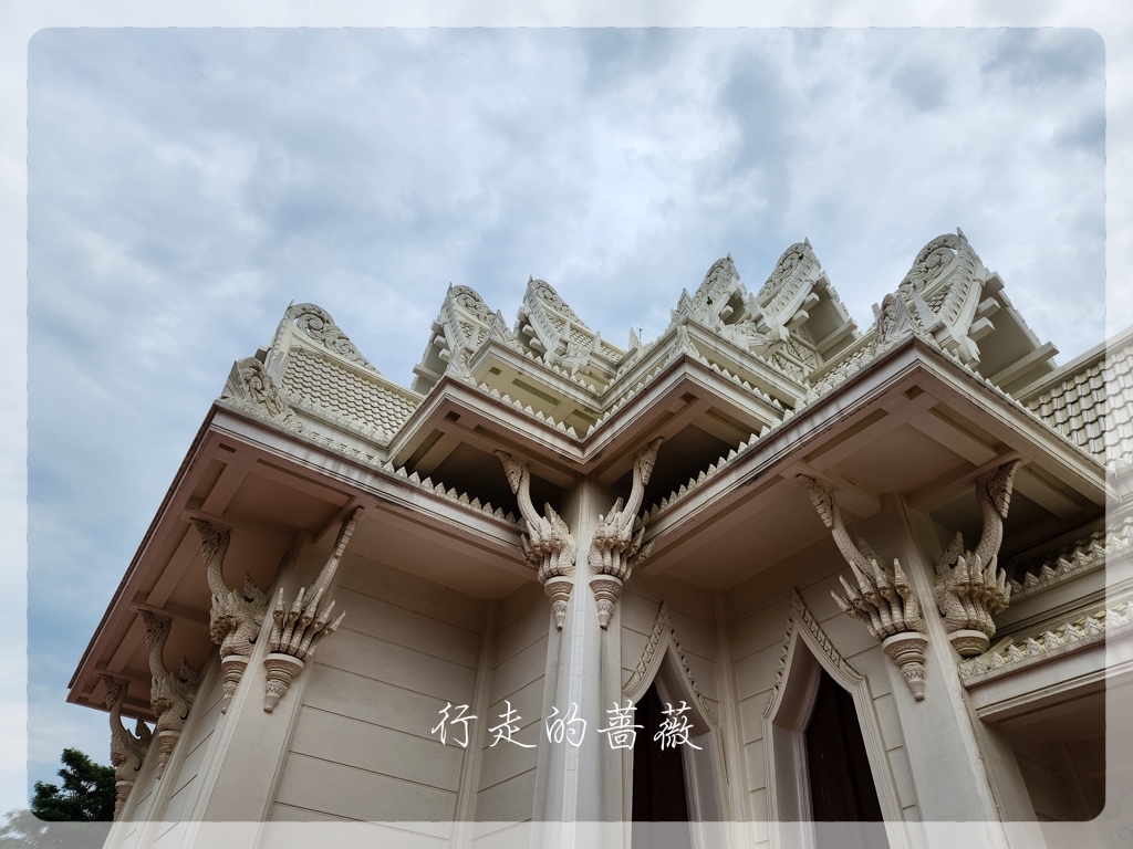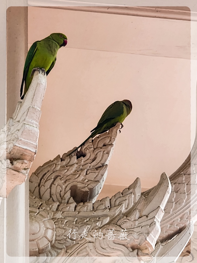 小乘佛教这一边的风格比较熟悉,大部分是东南亚的国家。泰国寺院↓据说是园区最宏伟的院落,白色的寺庙独树一帜,设计也是感觉和泰国本土非常一致。花园里好欢乐,屋檐下面有好多的绿色鹦鹉。旁边蓝屋顶的建筑据说是冥想中心。