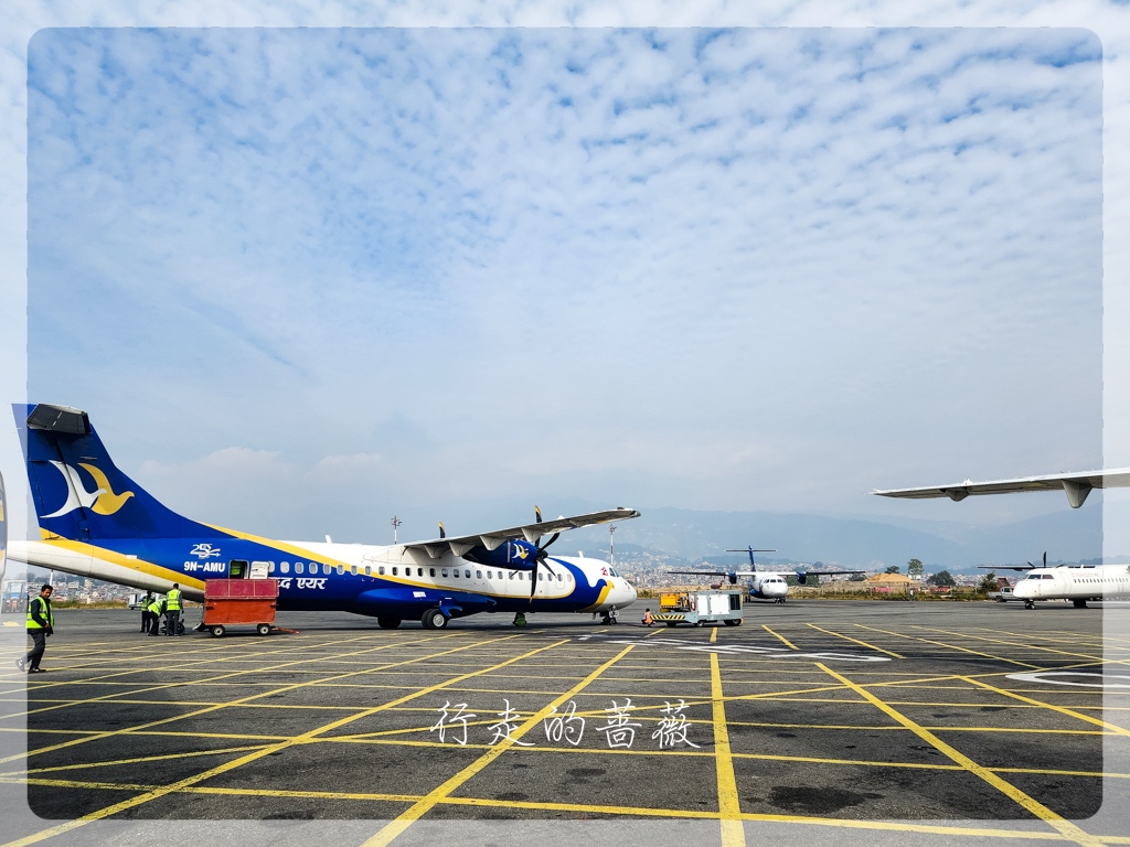 进来大厅,是一眼能望到边的那种面积大小,值机柜台只有一个很不起眼的窗口。去安检口问了下,还不能进去候机,就坐在大厅等候。一直有人来人往,但大多数都在Cargo Office货运柜台?排队,可能相当于寄快递吧。 环顾了下四周,大概只有我和这位白头发的法国人↓不是本地人,快到起飞的时候,刚才我咨询的安检工作人员还特意过来大厅喊我们俩,告诉我们可以安检了,还是挺细心的。安检就两个口,男女分开,很敷衍的检查了一下。安检出来就到了小小的候机室,继续等候值机。 飞机上坐的满满的人,我特意选了窗户的位置,风景真好啊,喜马拉雅雪山一路飘过,虽然山峰我根本分不清哪个是哪个。飞行时间大概也就半小时,如果坐汽车需要十几个小时的颠簸。