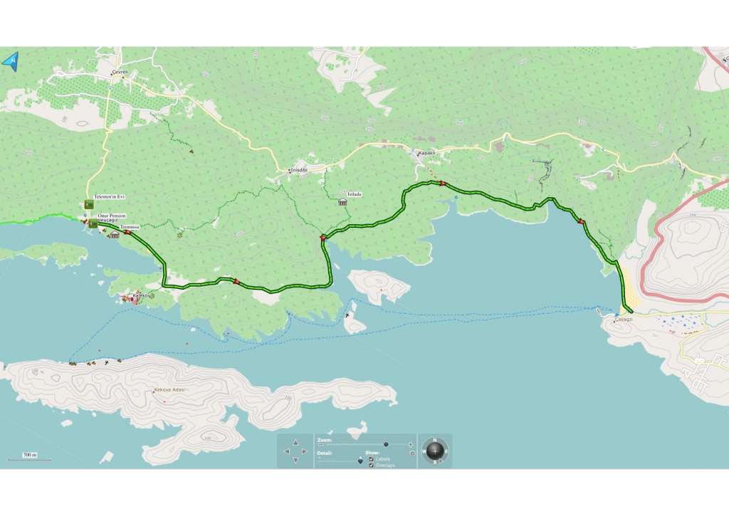徒步第十天,途径Simena城堡和造船厂,文档数据:Ücagiz – Cayagzi,15.3km,+230 m / -230m。实际手表数据:15.63km,+402m/-392m,4h53m。