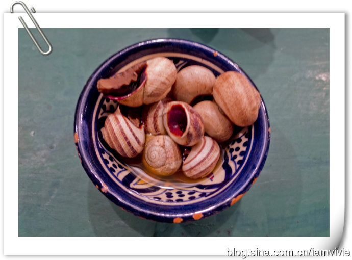 这个也是著名特产–蜗牛,来之前看评论说什么的都有,有人说特别好吃,有人说味道太腥不好吃。我和Lin要了一碗,额,啥味道都没有啊! 后来在摩洛哥吃得越来越多的食物,发现摩洛哥事物的特点就是没味道!强烈建议大家去摩洛哥的话,带瓶辣椒酱什么的,否则每天吃饭都没滋没味的唉。