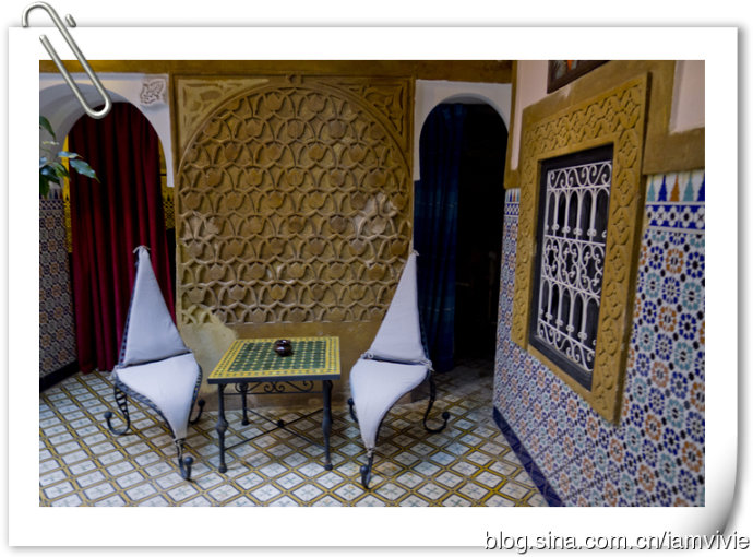 这一家叫做RIAD DAR TAMLIL,旅社人很好,虽然我已经付了定金,但是因为飞机取消,我只能晚一天到,所以写邮件希望能免费帮我取消一晚住宿,他们立刻就回复说可以。而且这一家是按照人头收费的,我一个人住,每晚就是23欧,如果两个人虽然还是一间屋子就收费要贵了,对于独自旅行者还是很划算的。之后小叶和我一起住一晚,就被要求多收6欧,也是很合情合理的。我就住在上图窗户的那一间,屋里虽然有些旧,但是还是那句话,非常摩洛风情!屋里有一个电暖气,晚上还是很管用的。
