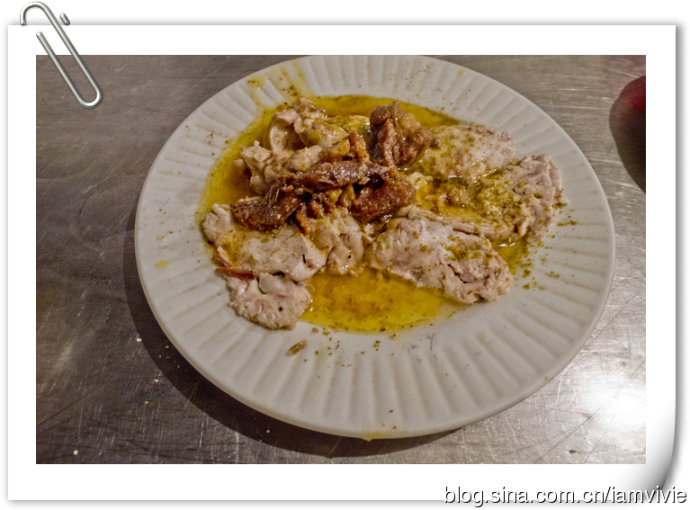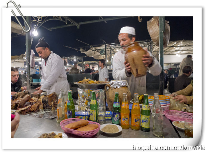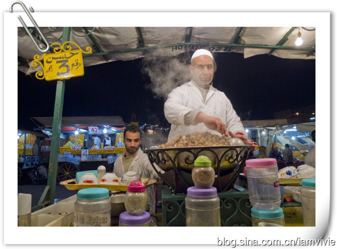Zizzo已经来摩洛哥混了一阵子了,对这儿门儿清,各种经验传授一番。最重要的一条是,人家问你哪儿来的,别说中国,加拿大更别提,要说比摩洛哥更穷的地方,例如尼泊尔之类的。矮油,您看着像地道的尼泊尔啊,我们哪儿像了唉。。。Zizzo还带着我大街小巷里转了一圈,就他那语速和那步伐速度,我可没有过目不忘的记忆力啊,七七八八忘的比记的还要多。最后他带我到他天天吃的一个摊位上吃了羊脑和羊舌!
